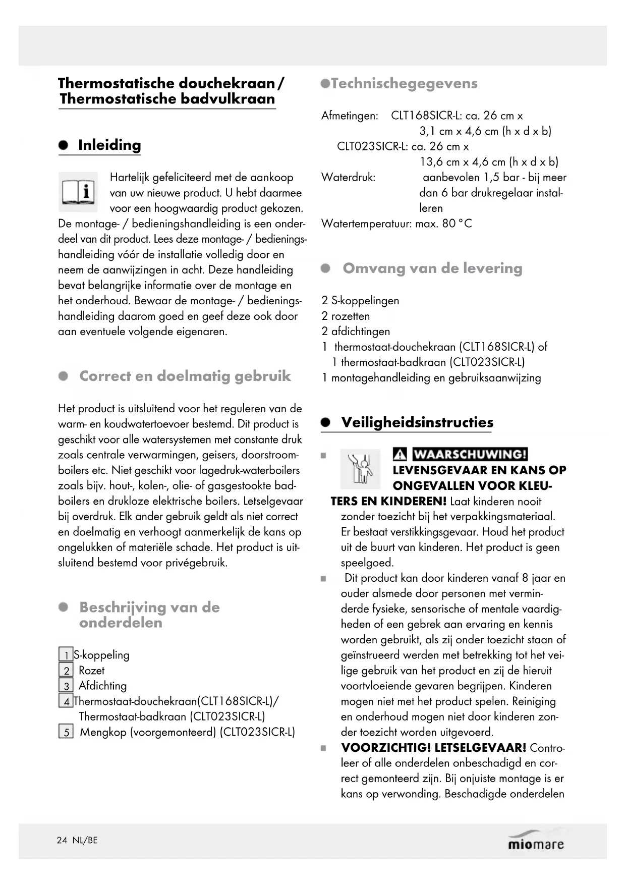 Mengkop (voorgemonteerd) (CLT023SICR-L) Technische gegevens Afmetingen: CLT168SICR-L: ca. 26 cm x 3,1 cm x 4,6 cm (h x d x b) CLT023SICR-L: ca. 26 cm x 13,6 cm x 4,6 cm (h x d x b) Waterdruk: aanbevolen 1,5 bar - bij meer dan 6 bar drukregelaar instal- leren Watertemperatuur: max. 80 °C Omvang van de levering 2 S-koppelingen 2 rozetten 2 afdichtingen 1 thermostaat-douchekraan (CLT168SICR-L) of 1 thermostaat-badkraan (CLT023SICR-L) 1 montagehandleiding en gebruiksaanwijzing Veiligheidsinstructies