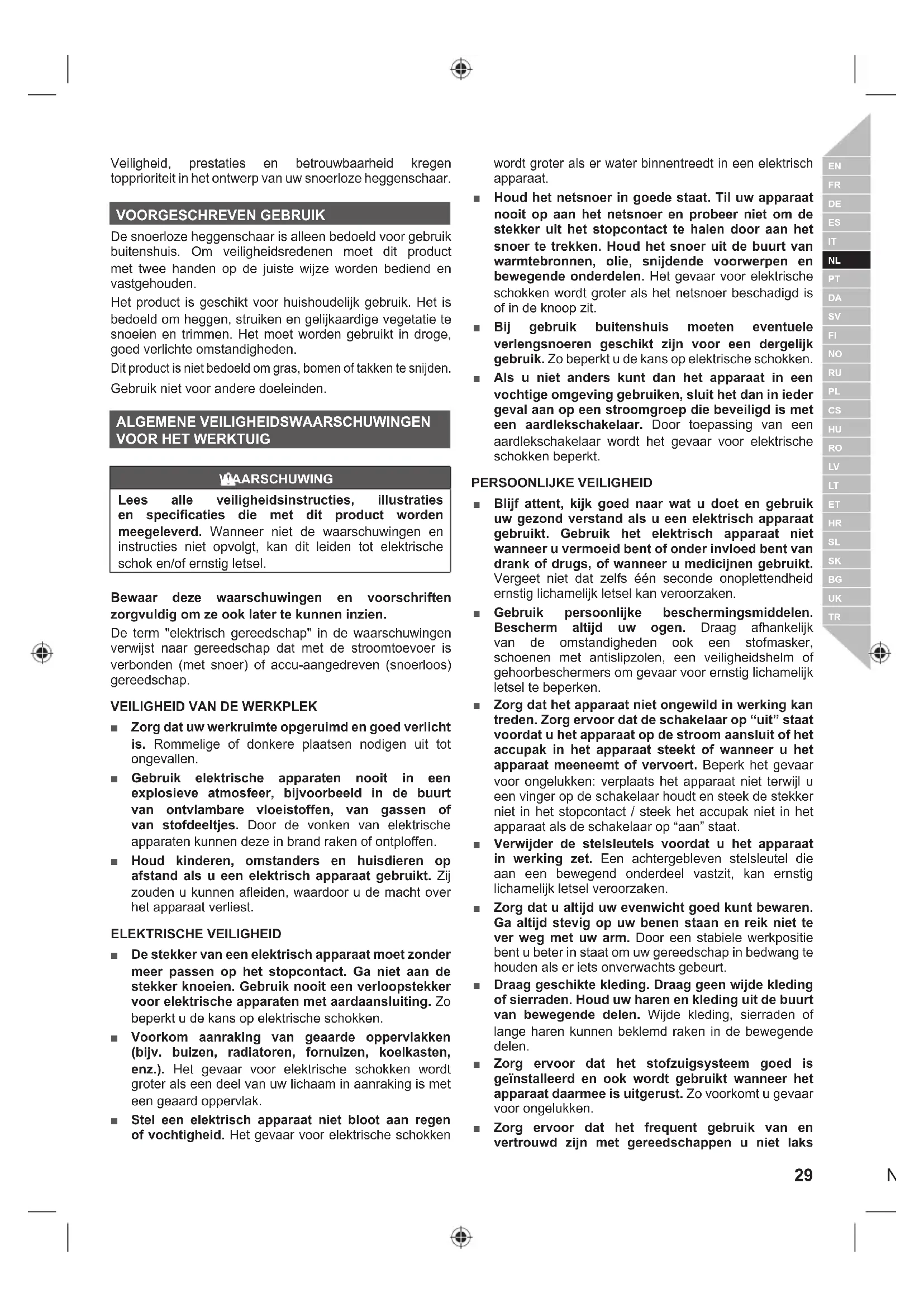 SNOER ■ U mag het apparaat niet overbelasten. Gebruik een apparaat dat geschikt is voor het werk dat u gaat doen. Uw elektrisch apparaat zal veiliger en zekerder werken als u het gebruikt op het toerental waarvoor het berekend is. ■ Gebruik een elektrisch apparaat niet als u het niet meer met de schakelaar aan en uit kunt zetten. Een apparaat dat niet meer op de normale manier aan-en uitgezet kan worden, is gevaarlijk en moet absoluut worden gerepareerd. ■ Koppel de stekker los van de stroombron en/ of verwijder de accu, indien deze afneembaar is, van het gereedschap voordat u instellingen aanpast, accessoires wijzigt of voordat u elektrisch gereedschap opbergt. Zo verkleint u het risico dat het apparaat ongewild in werking treedt. ■ Berg elektrische apparaten weg buiten bereik van kinderen. Laat het apparaat niet gebruiken door personen die het apparaat niet kennen of geen kennis hebben genomen van de veiligheidsvoorschriften. Elektrische apparaten zijn gevaarlijk in handen van onervaren personen. ■ Het onderhoud van elektrisch gereedschap en accessoires. Controleer de uitlijning van de bewegende delen. Kijk of er geen onderdelen zijn gebroken. Controleer de montage en alle andere elementen die de goede werking van het gereedschap kunnen beïnvloeden. Als er iets beschadigd is, dient u uw apparaat eerst te laten herstellen voordat u het weer gebruikt. Ongelukken zijn vaak te wijten aan de slechte staat van onderhoud van het gereedschap. ■ Houd uw gereedschap altijd scherp en schoon. Wanneer het mes van snijgereedschap goed scherp en schoon is, bestaat er minder kans dat het geblokkeerd raakt. Ook kunt u het apparaat dan beter onder controle houden. ■ Gebruik het elektrisch apparaat, de accessoires, de hulpstukken, enz. in overeenstemming met deze gebruiksvoorschriften en houd daarbij rekening met de gebruiksomstandigheden en de gewenste toepassingen. Gebruik een elektrisch apparaat uitsluitend voor de toepassingen waarvoor het bestemd is om gevaarlijke situaties te vermijden. ■ Zorg dat handvatten en handgrepen droog, schoon en vrij van olie en vet blijven. Gladde handvatten en handgrepen maken het onmogelijk het gereedschap in onverwachte situaties veilig te hanteren en te bedienen.