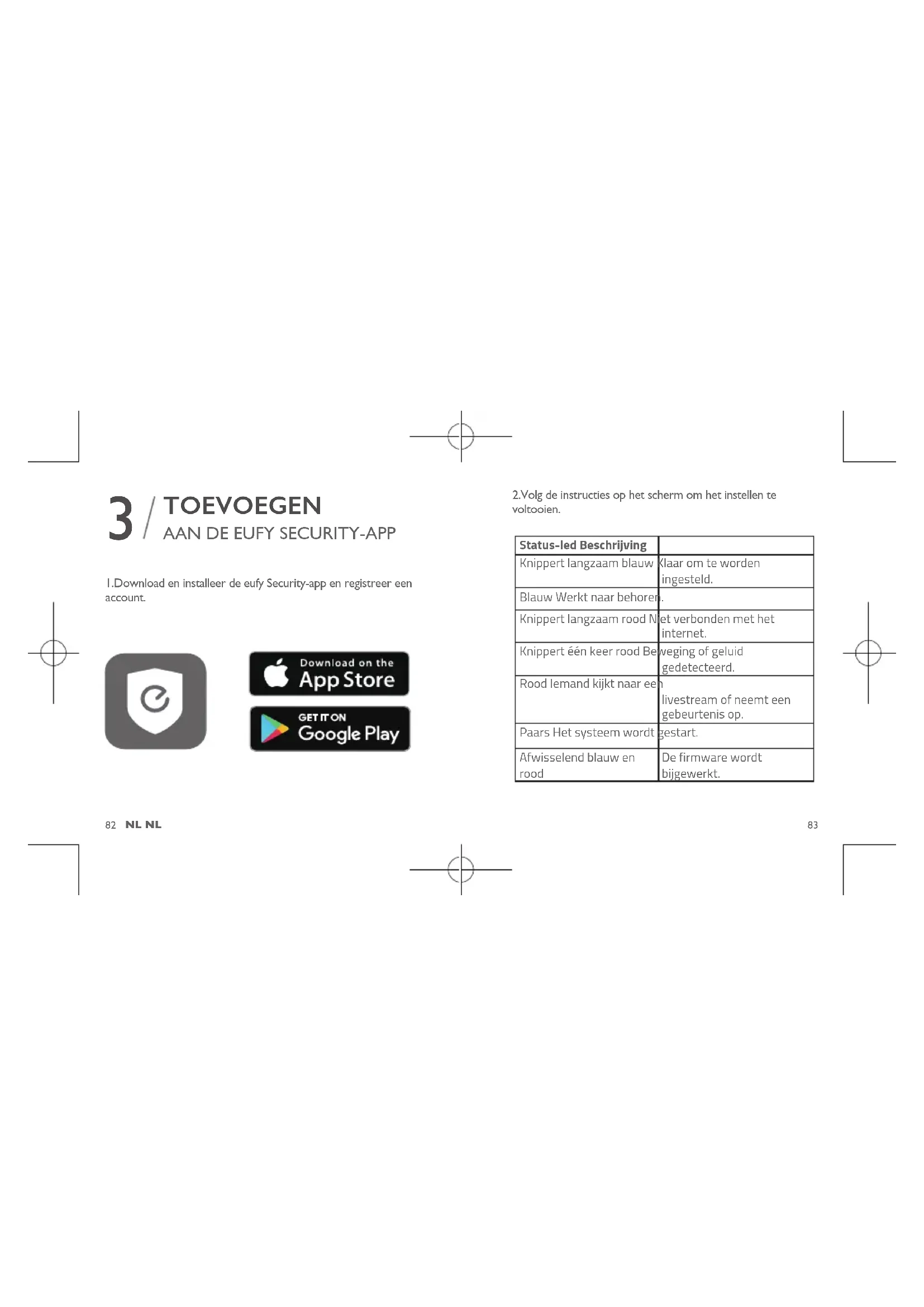 1.Download en installeer de eufy Security-app en registreer een account. 2.Volg de instructies op het scherm om het instellen te voltooien. Status-led Beschrijving Knippert langzaam blauw Klaar om te worden ingesteld. Blauw Werkt naar behoren. Knippert langzaam rood Niet verbonden met het internet. Knippert één keer rood Beweging of geluid gedetecteerd. Rood Iemand kijkt naar een livestream of neemt een gebeurtenis op. Paars Het systeem wordt gestart. Afwisselend blauw en rood De firmware wordt bijgewerkt.84 NL NL 85 INDOORCAM MONTAGGIO