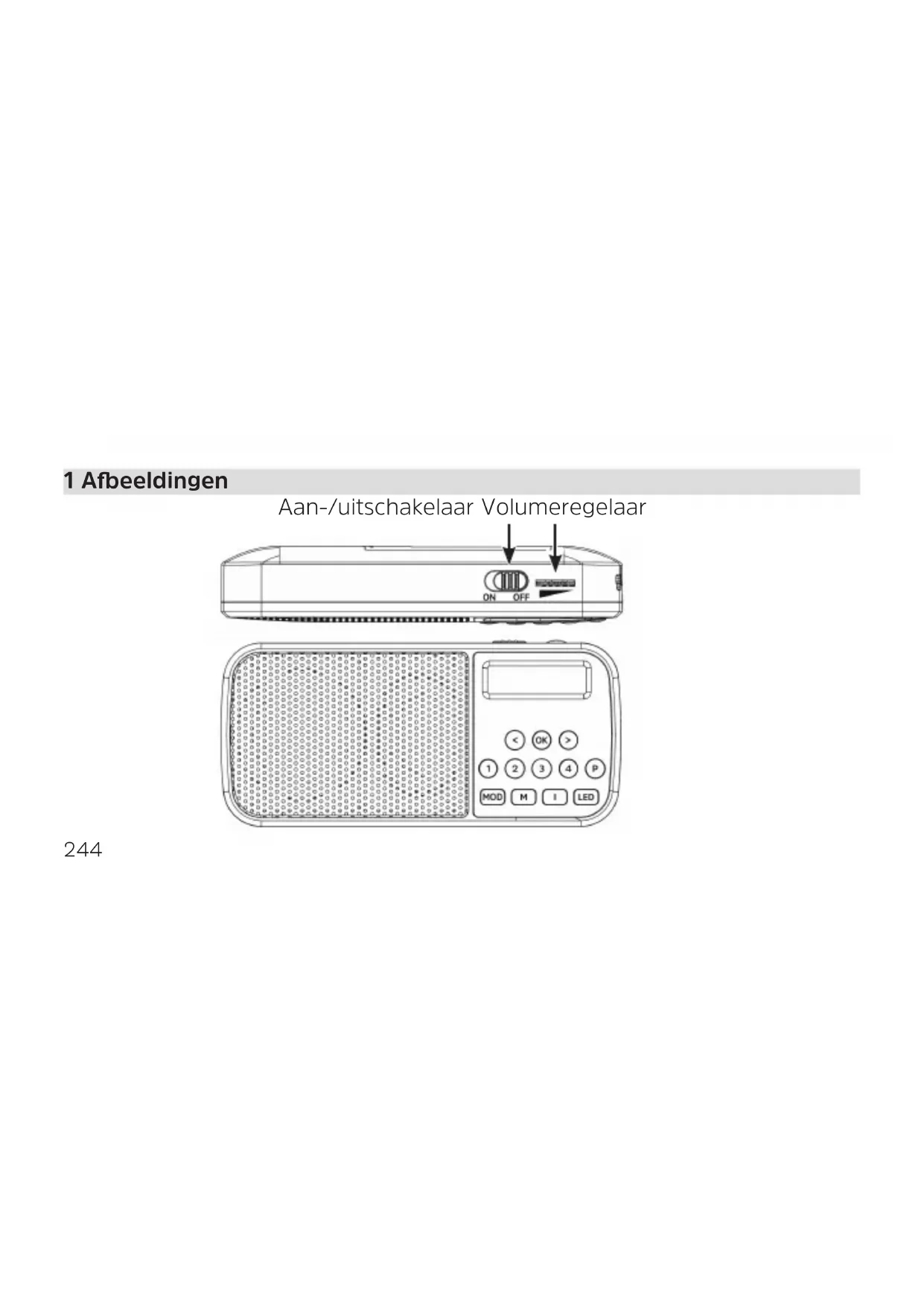 < / > Selectie links/rechts, zenderlijst. OK Selectie bevestigen. 1...4 Snelkeuzetoetsen favorietengeheugen. P Favorietengeheugen (1...20). MOD Bron schakelen tussen DAB+, FM, USB, AUX. M Hoofdmenu. I Schakelt tussen de weergave op het display. Led Activeert de zijled (zaklamp). Bovendien gee de led de laadtoestand van de baerij aan: Blauw = baerij wordt opgeladen, Groen = baerij opgeladen, Rood = baerij zwak.246