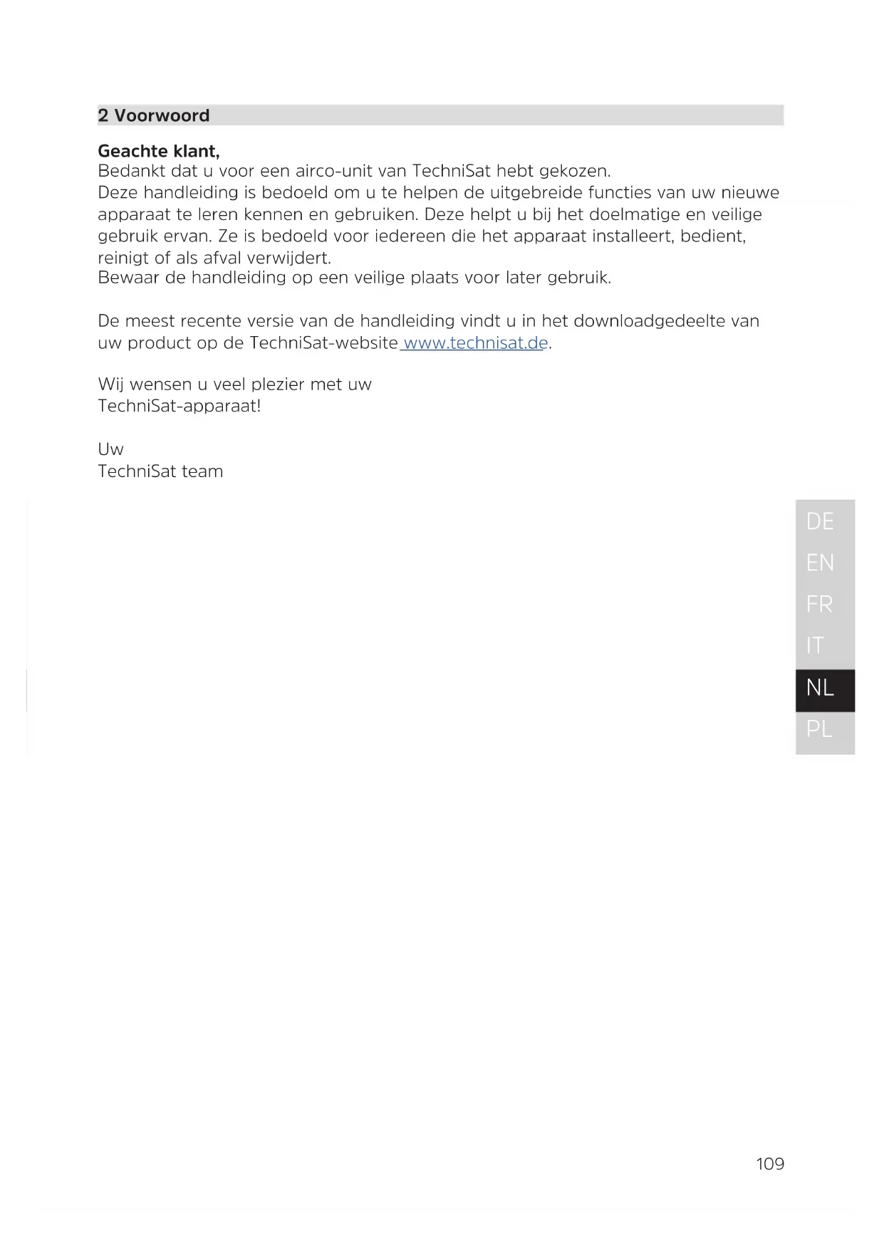 2 Voorwoord Geachte klant, Bedankt dat u voor een airco-unit van TechniSat hebt gekozen. Deze handleiding is bedoeld om u te helpen de uitgebreide functies van uw nieuwe apparaat te leren kennen en gebruiken. Deze helpt u bij het doelmatige en veilige gebruik ervan. Ze is bedoeld voor iedereen die het apparaat installeert, bedient, reinigt of als afval verwijdert. Bewaar de handleiding op een veilige plaats voor later gebruik. De meest recente versie van de handleiding vindt u in het downloadgedeelte van uw product op de TechniSat-website www.technisat.de. Wij wensen u veel plezier met uw TechniSat-apparaat!