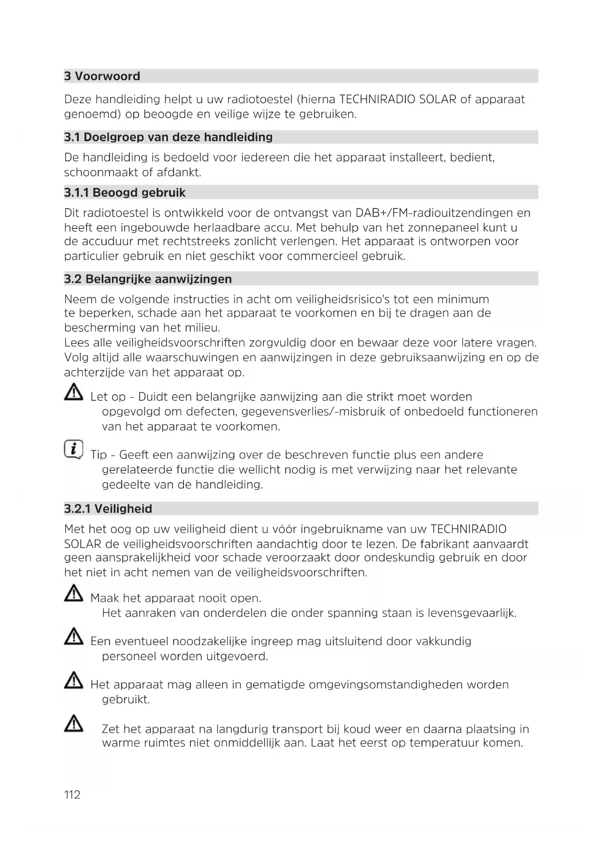 Met het oog op uw veiligheid dient u vóór ingebruikname van uw TECHNIRADIO SOLAR de veiligheidsvoorschrien aandachtig door te lezen. De fabrikant aanvaardt geen aansprakelijkheid voor schade veroorzaakt door ondeskundig gebruik en door het niet in acht nemen van de veiligheidsvoorschrien. Maak het apparaat nooit open. Het aanraken van onderdelen die onder spanning staan is levensgevaarlijk. Een eventueel noodzakelijke ingreep mag uitsluitend door vakkundig personeel worden uitgevoerd. Het apparaat mag alleen in gematigde omgevingsomstandigheden worden gebruikt. Zet het apparaat na langdurig transport bij koud weer en daarna plaatsing in warme ruimtes niet onmiddellijk aan. Laat het eerst op temperatuur komen.113