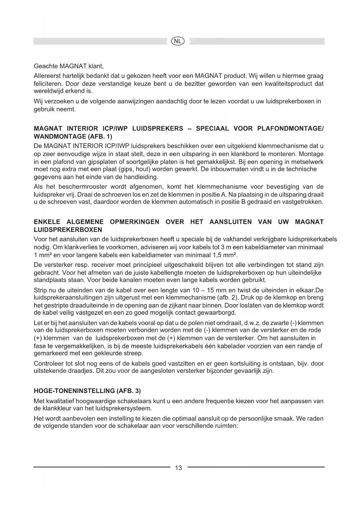 Toutes les enceintes MAGNAT sont conçues et construites pour fournir une reproduction sonore optimale lorsque les commandes de tonalité sont en position centrale – c’est-à-dire lorsque la sortie de l’amplicateur est „linéaire“. Si vous poussez les commandes de graves et d’aiguës trop loin, vous augmenterez la puissance fournie aux woofers et/ou aux tweeters; sous des niveaux élevés, ceci peut véritablement détruire les enceintes! Si la puissance de sortie de votre amplicateur est bien plus importante que la puissance nominale que vos enceintes peuvent accepter, les crêtes de puissance soudaines peuvent les détruire. Même si ce n’est pas fréquent dans la réalité, rappelez-vous que ceci peut toujours se produire. D’autre part, des amplicateurs dont la puissance de sortie est faible peuvent présenter un danger important pour vos enceintes à des volumes moyens. Ceci peut paraître étrange mais la raison est très simple: des amplicateurs de faible puissance sont bien plus rapidement surchargés que des amplicateurs puissants; cette surcharge provoque des distorsions mesurables et audibles, qui, pour vos enceintes, sont plus dangereuses que quoi que ce soit d’autre. Dès que vous percevez une quelconque distorsion, baissez le volume immédiatement! Si vous aimez écouter de la musique à niveau élevé assurez-vous que votre amplicateur peut fournir au moins autant de puissance que puissance nominale de vos enceintes. 11EN GÉNÉRAL ... Les amplicateurs, les tuners et les lecteurs de CD/DVD peuvent tous produire des sons inaudibles parce que leur fréquence est très élevée – et ceci ne vaut pas que pour les produits bon marché. Si vos tweeters tombent en panne alors que vous ne les utilisez qu’à des volumes faibles ou moyens, faites vérier votre installation par un technicien qualié qui recherchera les signaux inaudibles dangereux. SPECIFICATIONS TECHNIQUES Interior ICP 262 Interior ICP 82 Puissance nominale: 70 / 120 W 80 / 140 W Impédance: 2 x 8 Ohm 8 Ohm Crossover frequency: 4 000 Hz 4 000 Hz Bande passante: 36 – 24 000 Hz 34– 24 000 Hz Puissance recommandée en sortie de l’amplicateur: 20 – 140 W 20 – 160 W Efcacité (1W/ 1m): 90 dB 91 dB Dimensions extérieures Ø: 233 mm 275 mm Découpe Ø: 198 mm 240 mm Profondeur d‘encastrement: 88 mm 102 mm Interior ICP 62 Interior ICP 52 Puissance nominale: 70 / 120 W 60 / 100 W Impédance: 8 Ohm 8 Ohm Crossover frequency: 4 000 Hz 4 000 Hz Bande passante: 36 – 24 000 Hz 38 – 24 000 Hz Puissance recommandée en sortie de l’amplicateur: 20 – 140 W 20 – 120 W Efcacité (1W/ 1m): 90 dB 89 dB Dimensions extérieures Ø: 233 mm 202 mm Découpe Ø: 198 mm 168 mm Profondeur d‘encastrement: 88 mm 81 mm Interior IWP 82 Interior IWP 62 Puissance nominale: 80 / 140 W 70 / 120 W Impédance: 8 Ohm 8 Ohm Crossover frequency: 3 800 Hz 3 800 Hz Bande passante: 34 – 26 000 Hz 36 – 26 000 Hz Puissance recommandée en sortie de l’amplicateur: 20 – 160 W 20 – 140 W Efcacité (1W/ 1m): 91 dB 90 dB Dimensions extérieures (l x h): 254 x 359 mm 218 x 305 mm Découpe (l x h): 218 x 321 mm 185 x 272 mm Profondeur d‘encastrement: 88 mm 67 mm SOUS TOUTES RESERVES DE MODIFICATIONS TECHNIQUES. 12Geachte MAGNAT klant, Allereerst hartelijk bedankt dat u gekozen heeft voor een MAGNAT product. Wij willen u hiermee graag feliciteren. Door deze verstandige keuze bent u de bezitter geworden van een kwaliteitsproduct dat wereldwijd erkend is. Wij verzoeken u de volgende aanwijzingen aandachtig door te lezen voordat u uw luidsprekerboxen in gebruik neemt. MAGNAT INTERIOR ICP/IWP LUIDSPREKERS – SPECIAAL VOOR PLAFONDMONTAGE/ WANDMONTAGE (AFB. 1) De MAGNAT INTERIOR ICP/IWP luidsprekers beschikken over een uitgekiend klemmechanisme dat u op zeer eenvoudige wijze in staat stelt, deze in een uitsparing in een klankbord te monteren. Montage in een plafond van gipsplaten of soortgelijke platen is het gemakkelijkst. Bij een opening in metselwerk moet nog extra met een plaat (gips, hout) worden gewerkt. De inbouwmaten vindt u in de technische gegevens aan het einde van de handleiding. Als het beschermrooster wordt afgenomen, komt het klemmechanisme voor bevestiging van de luidspreker vrij. Draai de schroeven los en zet de klemmen in positie A. Na plaatsing in de uitsparing draait u de schroeven vast, daardoor worden de klemmen automatisch in positie B gedraaid en vastgetrokken. ENKELE ALGEMENE OPMERKINGEN OVER HET AANSLUITEN VAN UW MAGNAT LUIDSPREKERBOXEN Voor het aansluiten van de luidsprekerboxen heeft u speciale bij de vakhandel verkrijgbare luidsprekerkabels nodig. Om klankverlies te voorkomen, adviseren wij voor kabels tot 3 m een kabeldiameter van minimaal 1 mm² en voor langere kabels een kabeldiameter van minimaal 1,5 mm². De versterker resp. receiver moet principieel uitgeschakeld blijven tot alle verbindingen tot stand zijn gebracht. Voor het afmeten van de juiste kabellengte moeten de luidsprekerboxen op hun uiteindelijke standplaats staan. Voor beide kanalen moeten even lange kabels worden gebruikt. Strip nu de uiteinden van de kabel over een lengte van 10 – 15 mm en twist de uiteinden in elkaar.De luidsprekeraansluitingen zijn uitgerust met een klemmechanisme (afb. 2). Druk op de klemkop en breng het gestripte draaduiteinde in de opening aan de zijkant naar binnen. Door loslaten van de klemkop wordt de kabel veilig vastgezet en een zo goed mogelijk contact gewaarborgd. Let er bij het aansluiten van de kabels vooral op dat u de polen niet omdraait, d.w.z. de zwarte (-) klemmen van de luidsprekerboxen moeten verbonden worden met de (-) klemmen van de versterker en de rode (+) klemmen van de luidsprekerboxen met de (+) klemmen van de versterker. Om het aansluiten in fase te vergemakkelijken, is bij de meeste luidsprekerkabels één kabelader voorzien van een randje of gemarkeerd met een gekleurde streep. Controleer tot slot nog eens of de kabels goed vastzitten en er geen kortsluiting is ontstaan, b