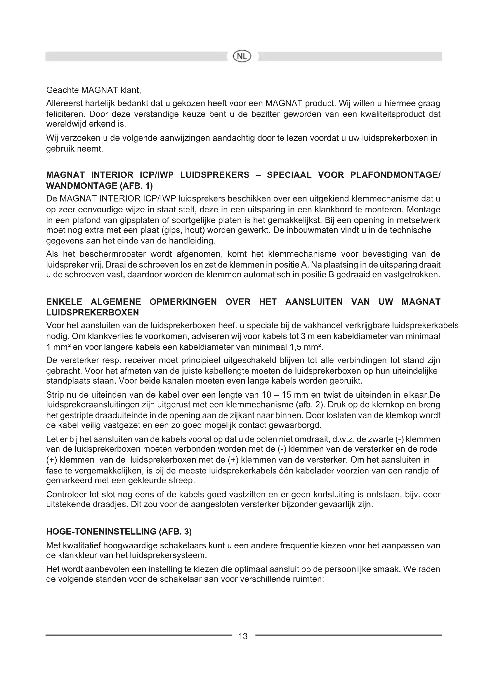 Toutes les enceintes MAGNAT sont conçues et construites pour fournir une reproduction sonore optimale lorsque les commandes de tonalité sont en position centrale – c’est-à-dire lorsque la sortie de l’amplicateur est „linéaire“. Si vous poussez les commandes de graves et d’aiguës trop loin, vous augmenterez la puissance fournie aux woofers et/ou aux tweeters; sous des niveaux élevés, ceci peut véritablement détruire les enceintes! Si la puissance de sortie de votre amplicateur est bien plus importante que la puissance nominale que vos enceintes peuvent accepter, les crêtes de puissance soudaines peuvent les détruire. Même si ce n’est pas fréquent dans la réalité, rappelez-vous que ceci peut toujours se produire. D’autre part, des amplicateurs dont la puissance de sortie est faible peuvent présenter un danger important pour vos enceintes à des volumes moyens. Ceci peut paraître étrange mais la raison est très simple: des amplicateurs de faible puissance sont bien plus rapidement surchargés que des amplicateurs puissants; cette surcharge provoque des distorsions mesurables et audibles, qui, pour vos enceintes, sont plus dangereuses que quoi que ce soit d’autre. Dès que vous percevez une quelconque distorsion, baissez le volume immédiatement! Si vous aimez écouter de la musique à niveau élevé assurez-vous que votre amplicateur peut fournir au moins autant de puissance que puissance nominale de vos enceintes. 11EN GÉNÉRAL ... Les amplicateurs, les tuners et les lecteurs de CD/DVD peuvent tous produire des sons inaudibles parce que leur fréquence est très élevée – et ceci ne vaut pas que pour les produits bon marché. Si vos tweeters tombent en panne alors que vous ne les utilisez qu’à des volumes faibles ou moyens, faites vérier votre installation par un technicien qualié qui recherchera les signaux inaudibles dangereux. SPECIFICATIONS TECHNIQUES Interior ICP 262 Interior ICP 82 Puissance nominale: 70 / 120 W 80 / 140 W Impédance: 2 x 8 Ohm 8 Ohm Crossover frequency: 4 000 Hz 4 000 Hz Bande passante: 36 – 24 000 Hz 34– 24 000 Hz Puissance recommandée en sortie de l’amplicateur: 20 – 140 W 20 – 160 W Efcacité (1W/ 1m): 90 dB 91 dB Dimensions extérieures Ø: 233 mm 275 mm Découpe Ø: 198 mm 240 mm Profondeur d‘encastrement: 88 mm 102 mm Interior ICP 62 Interior ICP 52 Puissance nominale: 70 / 120 W 60 / 100 W Impédance: 8 Ohm 8 Ohm Crossover frequency: 4 000 Hz 4 000 Hz Bande passante: 36 – 24 000 Hz 38 – 24 000 Hz Puissance recommandée en sortie de l’amplicateur: 20 – 140 W 20 – 120 W Efcacité (1W/ 1m): 90 dB 89 dB Dimensions extérieures Ø: 233 mm 202 mm Découpe Ø: 198 mm 168 mm Profondeur d‘encastrement: 88 mm 81 mm Interior IWP 82 Interior IWP 62 Puissance nominale: 80 / 140 W 70 / 120 W Impédance: 8 Ohm 8 Ohm Crossover frequency: 3 800 Hz 3 800 Hz Bande passante: 34 – 26 000 Hz 36 – 26 000 Hz Puissance recommandée en sortie de l’amplicateur: 20 – 160 W 20 – 140 W Efcacité (1W/ 1m): 91 dB 90 dB Dimensions extérieures (l x h): 254 x 359 mm 218 x 305 mm Découpe (l x h): 218 x 321 mm 185 x 272 mm Profondeur d‘encastrement: 88 mm 67 mm SOUS TOUTES RESERVES DE MODIFICATIONS TECHNIQUES. 12Geachte MAGNAT klant, Allereerst hartelijk bedankt dat u gekozen heeft voor een MAGNAT product. Wij willen u hiermee graag feliciteren. Door deze verstandige keuze bent u de bezitter geworden van een kwaliteitsproduct dat wereldwijd erkend is. Wij verzoeken u de volgende aanwijzingen aandachtig door te lezen voordat u uw luidsprekerboxen in gebruik neemt. MAGNAT INTERIOR ICP/IWP LUIDSPREKERS – SPECIAAL VOOR PLAFONDMONTAGE/ WANDMONTAGE (AFB. 1) De MAGNAT INTERIOR ICP/IWP luidsprekers beschikken over een uitgekiend klemmechanisme dat u op zeer eenvoudige wijze in staat stelt, deze in een uitsparing in een klankbord te monteren. Montage in een plafond van gipsplaten of soortgelijke platen is het gemakkelijkst. Bij een opening in metselwerk moet nog extra met een plaat (gips, hout) worden gewerkt. De inbouwmaten vindt u in de technische gegevens aan het einde van de handleiding. Als het beschermrooster wordt afgenomen, komt het klemmechanisme voor bevestiging van de luidspreker vrij. Draai de schroeven los en zet de klemmen in positie A. Na plaatsing in de uitsparing draait u de schroeven vast, daardoor worden de klemmen automatisch in positie B gedraaid en vastgetrokken. ENKELE ALGEMENE OPMERKINGEN OVER HET AANSLUITEN VAN UW MAGNAT LUIDSPREKERBOXEN Voor het aansluiten van de luidsprekerboxen heeft u speciale bij de vakhandel verkrijgbare luidsprekerkabels nodig. Om klankverlies te voorkomen, adviseren wij voor kabels tot 3 m een kabeldiameter van minimaal 1 mm² en voor langere kabels een kabeldiameter van minimaal 1,5 mm². De versterker resp. receiver moet principieel uitgeschakeld blijven tot alle verbindingen tot stand zijn gebracht. Voor het afmeten van de juiste kabellengte moeten de luidsprekerboxen op hun uiteindelijke standplaats staan. Voor beide kanalen moeten even lange kabels worden gebruikt. Strip nu de uiteinden van de kabel over een lengte van 10 – 15 mm en twist de uiteinden in elkaar.De luidsprekeraansluitingen zijn uitgerust met een klemmechanisme (afb. 2). Druk op de klemkop en breng het gestripte draaduiteinde in de opening aan de zijkant naar binnen. Door loslaten van de klemkop wordt de kabel veilig vastgezet en een zo goed mogelijk contact gewaarborgd. Let er bij het aansluiten van de kabels vooral op dat u de polen niet omdraait, d.w.z. de zwarte (-) klemmen van de luidsprekerboxen moeten verbonden worden met de (-) klemmen van de versterker en de rode (+) klemmen van de luidsprekerboxen met de (+) klemmen van de versterker. Om het aansluiten in fase te vergemakkelijken, is bij de meeste luidsprekerkabels één kabelader voorzien van een randje of gemarkeerd met een gekleurde streep. Controleer tot slot nog eens of de kabels goed vastzitten en er geen kortsluiting is ontstaan, b