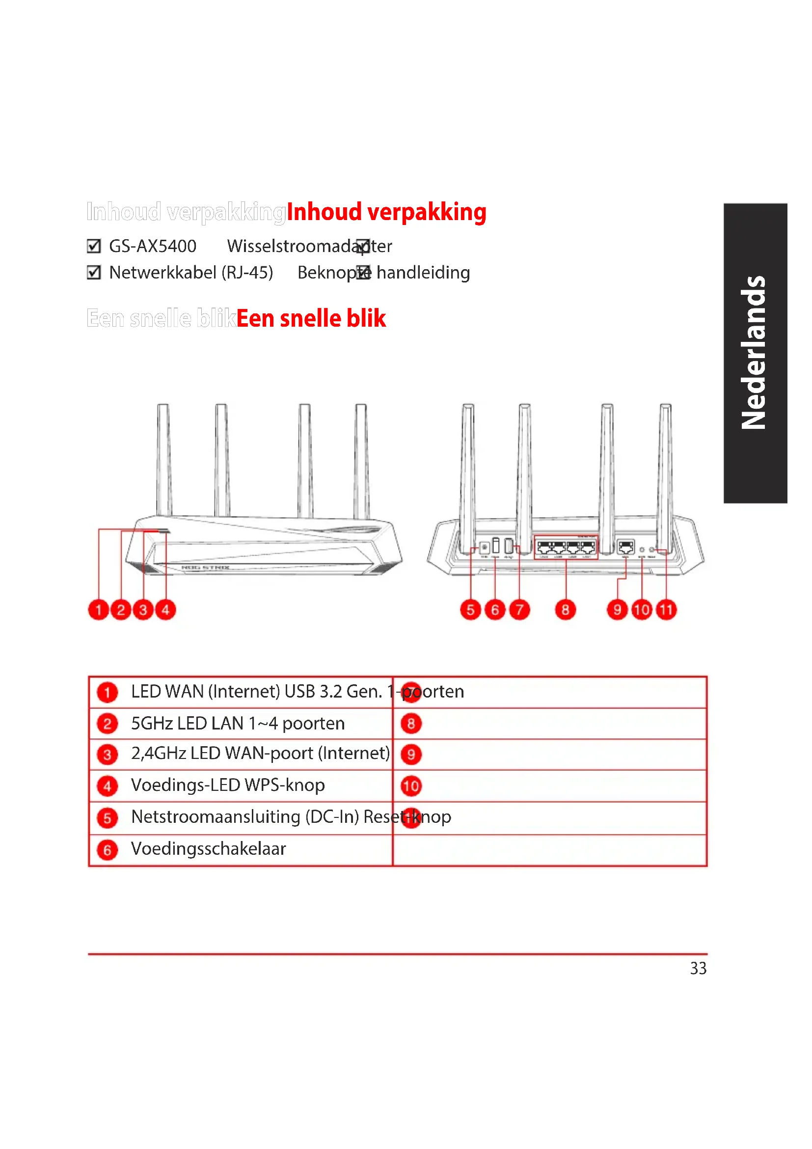 - Brugervejledningen kan hentes online på https://www.asus.com/support33 Nederlands Inhoud verpakkingInhoud verpakking GS-AX5400 Wisselstroomadapter Netwerkkabel (RJ-45) Beknopte handleiding Een snelle blikEen snelle blik LED WAN (Internet) USB 3.2 Gen. 1-poorten 5GHz LED LAN 1~4 poorten 2,4GHz LED WAN-poort (Internet) Voedings-LED WPS-knop Netstroomaansluiting (DC-In) Reset-knop Voedingsschakelaar34 Nederlands Uw draadloze router plaatsenUw draadloze router plaatsen Voor de beste draadloze signaaltransmissie tussen de draadloze router en de netwerkapparaten die erop zijn aangesloten, moet u het volgende doen: