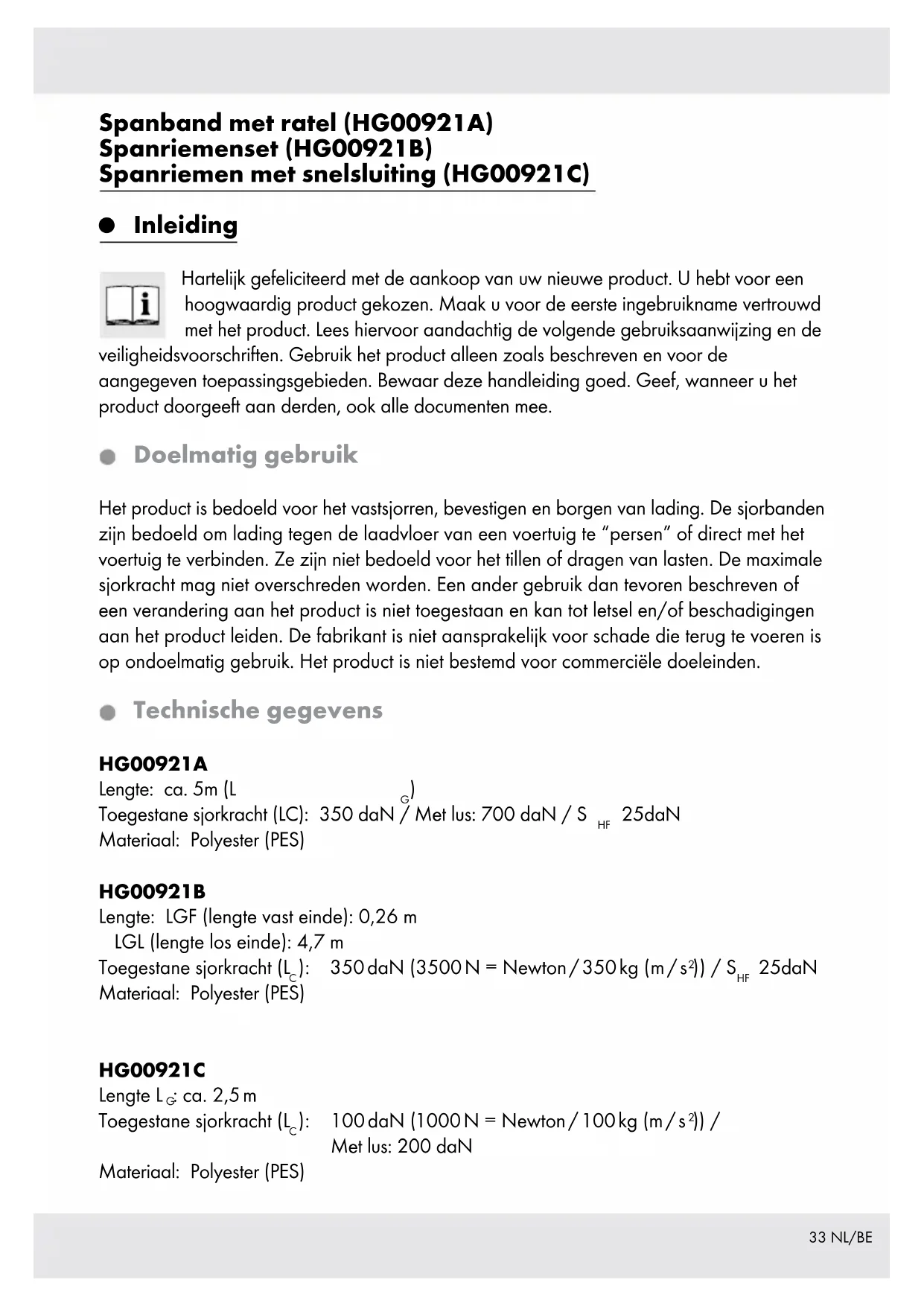 Leveringsomvang Controleer direkt na het uitpakken de omvang van de levering op volledigheid alsook de onberispelijke staat van het product en alle onderdelen. 1 x spanband met ratel, ca. 5 m (HG00921A) 1 x sjorband met spanratel en S-haak, ca. 0,26 m (HG00921B) 1 x sjorband met S-haak, ca. 4,7 m (HG00921B) 2 x sjorband met klemslot, ca. 2,5 m (HG00921C) 1 x gebruiksaanwijzing