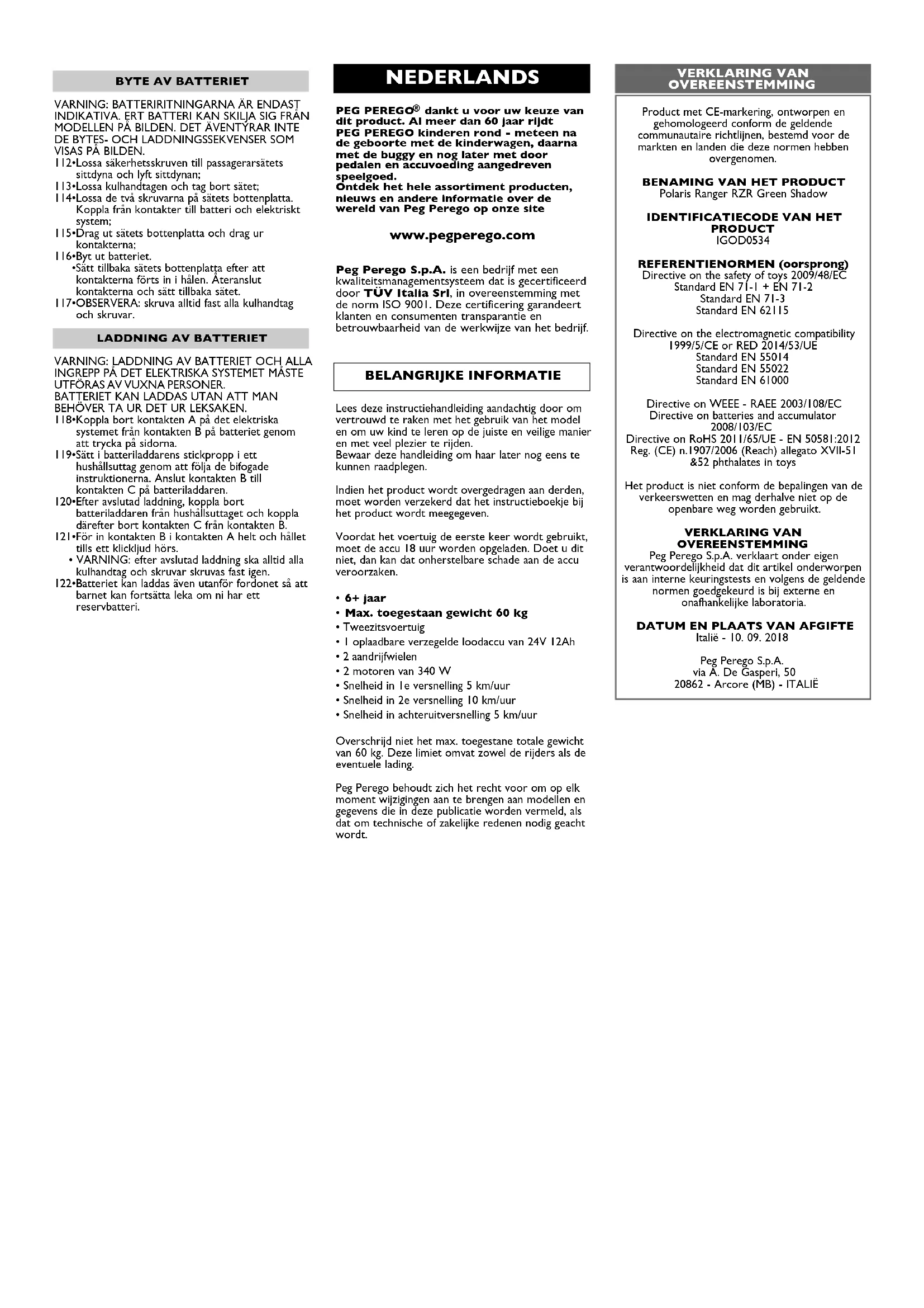 Italië - 10. 09. 2018 Peg Perego S.p.A. via A. De Gasperi, 50 20862 - Arcore (MB) - ITALIË NEDERLANDS VERKLARING VAN OVEREENSTEMMING BELANGRIJKE INFORMATIE Lees deze instructiehandleiding aandachtig door om vertrouwd te raken met het gebruik van het model en om uw kind te leren op de juiste en veilige manier en met veel plezier te rijden. Bewaar deze handleiding om haar later nog eens te kunnen raadplegen. Indien het product wordt overgedragen aan derden, moet worden verzekerd dat het instructieboekje bij het product wordt meegegeven. Voordat het voertuig de eerste keer wordt gebruikt, moet de accu 18 uur worden opgeladen. Doet u dit niet, dan kan dat onherstelbare schade aan de accu veroorzaken.