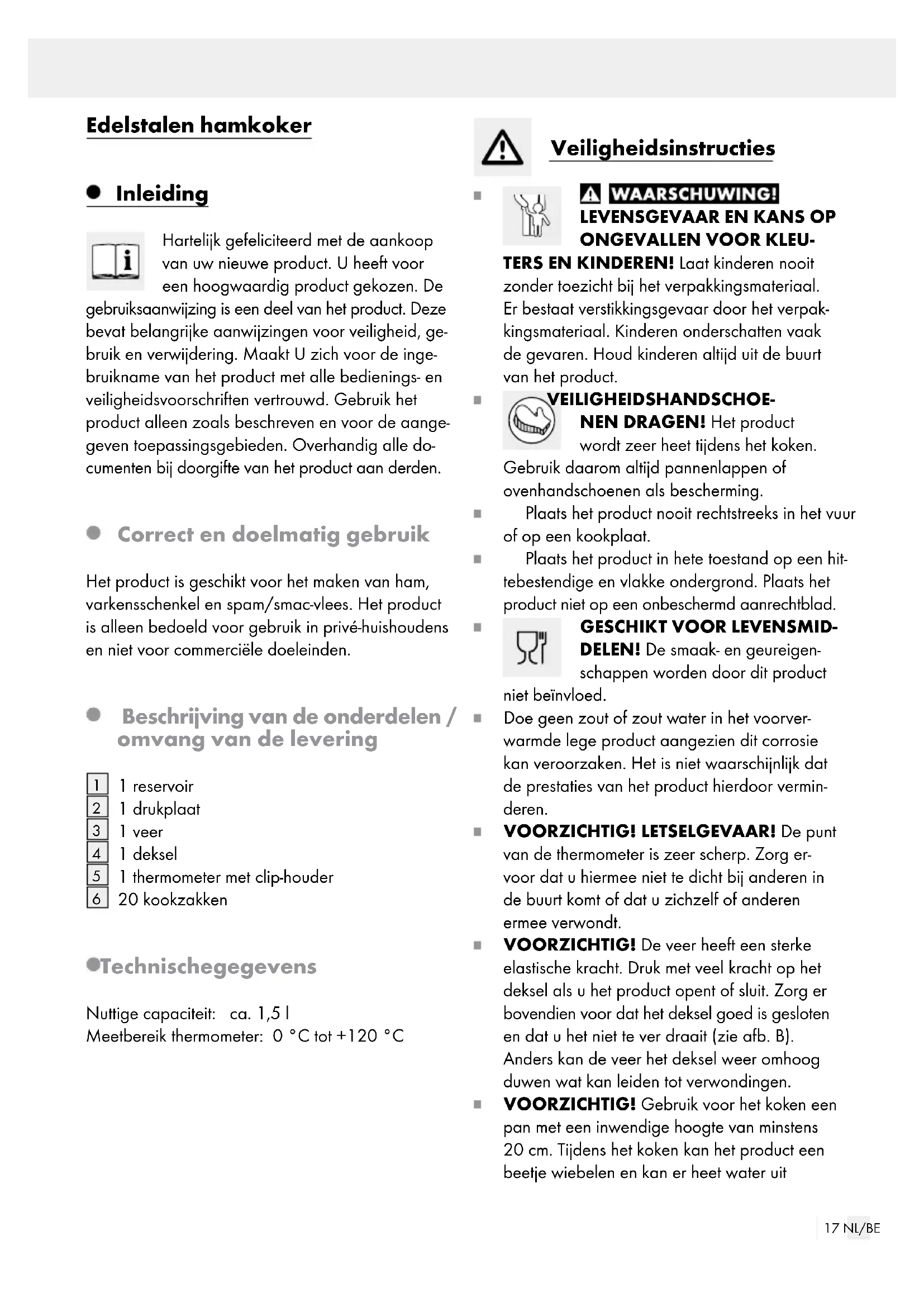 . Druk de inhoud zorg- vuldig omlaag om ingesloten luchtbellen te vermijden en sluit het product. Kook het product ca. 2,5 uur lang bij ca. 80–90 °C in heet water. Houd steeds de kern- temperatuur van de vleesmassa in de gaten. Deze is pas gaar als een temperatuur van 85 °C is bereikt. Plaats het product om af te koelen in koud water en vervolgens 12 uur in de koelkast. Reiniging en onderhoud Reinig en droog het product na elk gebruik grondig. Reinig het product met warm water en een mild schoonmaakmiddel. Gebruik voor het reinigen met de hand geen scherpe of puntige voorwerpen om het product niet te beschadigen. Gebruik geen agressieve schuurmiddelen. Het product is geschikt voor de vaat- wasser (geldt alleen voor reservoir, deksel en drukplaat). Na enige tijd kunnen mineralen in het water leiden tot vlekken of verkleuringen op het pro- duct. Om deze te verwijderen, kunt u er met een halve citroen overheen wrijven. Hardnekki- gere vlekken kunnen worden verwijderd met een mengsel van negen delen water en één deel azijn. Opmerking: de thermometer kan tijdens het ko- ken in de pan beslaan. Het condenswater verdwijnt langzaam naarmate de thermometer langer in de pan is.20 NL/BE Afvoer De verpakking bestaat uit milieuvriendelijke grond- stoffen die u via de plaatselijke recyclingcontainers kunt afvoeren. Informatie over de mogelijkheden om het uitge- diende product na gebruik te verwijderen, verstrekt uw gemeentelijke overheid. Garantie Het product wordt volgens strenge kwaliteitsrichtlij- nen zorgvuldig geproduceerd en voor levering grondig getest. In geval van schade aan het product kunt u rechtmatig beroep doen op de ver- koper van het product. Deze wettelijke rechten wor- den door onze hierna vermelde garantie niet beperkt. Op dit product verlenen wij 3 jaar garantie vanaf aankoopdatum. De garantieperiode start op de dag van aankoop. Bewaar de originele kassabon alstublieft. Dit document is nodig als bewijs voor aankoop. Wanneer binnen 3 jaar na de aankoopdatum van dit product een materiaal- of productiefout op- treedt, dan wordt het product door ons – naar onze keuze – gratis voor u gerepareerd of vervan- gen. Deze garantie komt te vervallen als het pro- duct beschadigd wordt, niet correct gebruikt of onderhouden wordt. De garantie geldt voor materiaal- en productiefouten. Deze garantie is niet van toepassing op producton- derdelen, die onderhevig zijn aan normale slijtage en hierdoor als aan slijtage onderhevige onderde- len gelden (bijv. batterijen) of voor beschadigingen aan breekbare onderdelen, zoals bijv. schakelaars, accu’s of dergelijke onderdelen, die gemaakt zijn van glas. Afwikkeling in geval van garantie Om een snelle afhandeling van uw reclamatie te waarborgen dient u de volgende instructies in acht te nemen: Houd bij alle vragen alstublieft de kassabon en het artikelnummer (bijv. IAN 123456_7890) als bewijs van aankoop bij de hand. Het artikelnummer vindt u op de typeplaat, inge- graveerd, op het titelblad van uw handleiding (linksonder) of als sticker op de achter- of onderzijde. Wanneer er storingen in de werking of andere ge- breken optreden, dient u eerst telefonisch of per e-mail contact met de onderstaande service-afde- ling op te nemen. Een als defect geregistreerd product kunt u dan samen met uw aankoopbewijs (kassabon) en vermelding van de concrete schade alsmede het tijdstip van optreden voor u franco aan het u mee- gedeelde servicepunt verzenden. Service Service Nederland Tel.: 0900 0400 223 (0,10 EUR / Min.) E-Mail: owim@lidl.nl Service Belgiё Tel.: 070 270 171 (0,15 EUR / Min.) E-Mail: owim@lidl.be21 PL Szynkowar ze stali szlachetnej Wstęp Gratulujemy Państwu zakupu nowego produktu. Zdecydowali się Państwo na zakup produktu najwyższej jakości. Przed uruchomieniem urządzenia po raz pierwszy zapo- znaj się z nim. W tym celu przeczytaj uważnie po- niższą instrukcję obsługi oraz wskazówki dotyczące bezpieczeństwa. Produkt należy użytkować w spo- sób tu opisany i zgodnie z określonym zakresem zastosowania. Należy przechowywać tę instrukcję w bezpiecznym miejscu. Przekazując produkt innej osobie, należy również przekazać wszystkie doku- menty. Zastosowanie zgodne z przeznaczeniem Produkt nadaje się do przyrządzania szynki, golonki i mielonki. Produkt przeznaczony jest wyłącznie do użytku w gospodarstwie domowym i nie jest prze- widziany do działalności zarobkowej. Opis części / Zakres dostawy
