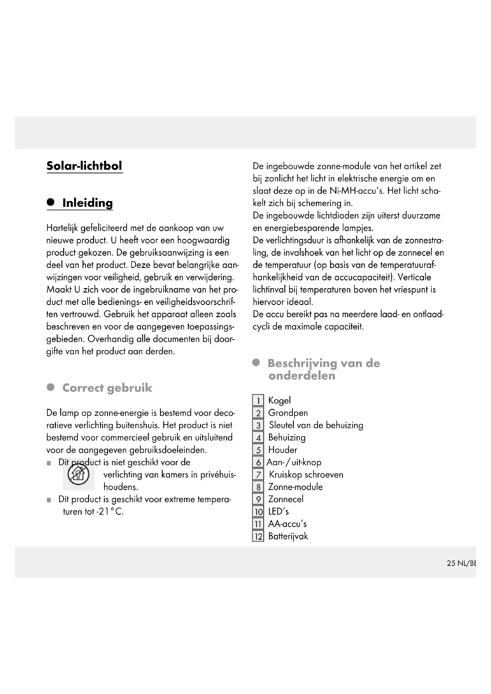 EN KINDEREN! Houd accu‘s uit de buurt van kinderen. Laat de accu‘s niet rondslingeren. Het gevaar bestaat dat deze door kinderen of huisdieren worden ingeslikt. Raadpleeg bij inslikken onmiddellijk een arts. Kinderen of personen met onvoldoende kennis over of ervaring in de omgang met het appa- raat of met beperkte lichamelijke, sensorische of geestelijke vermogens mogen het apparaat niet zonder toezicht of voorafgaande instructie door een voor hun veiligheid verantwoordelijke persoon gebruiken. Kinderen moeten onder toezicht staan, zodat ze niet met het apparaat kunnen spelen. Laat kinderen nooit zonder toezicht bij het verpakkingsmateriaal. Er bestaat kans op ver- stikking door verpakkingsmateriaal. Kinderen onderschatten vaak de gevaren. Houd kinde- ren altijd uit de buurt van het product.27 NL/BE Dit product is geen speelgoed en hoort niet thuis in kinderhanden. Kinderen begrijpen de gevaren die door de omgang met elektrische producten ontstaan niet. Gebruik het artikel niet als u beschadigingen constateert. GEVAAR EXPLOSIEGE- VAAR! Gebruik de lamp op zon- ne-energie niet in een explosieve omgeving waarin zich brandbare dampen, gassen of stoffen bevinden. Productspecifieke veiligheidsinstructies Stel de lamp op zonne-energie niet bloot aan sterke trillingen of sterke mechanische belas- tingen. Let erop, dat de zonnecel niet verontreinigd of in de winter met sneeuw en ijs bedekt is. Hierdoor wordt de werking van de zonnecel belemmerd. Lage temperaturen hebben een negatieve in- vloed op de gebruiksduur van de accu. Als u de lamp op zonne-energie langere tijd niet ge- bruikt, bijv. in de winter, moet hij gereinigd en op een droge, warme plaats bewaard worden. Schakel het apparaat uit voor het reinigen en opbergen. Neem in geval van beschadigingen, repara- ties of andere problemen aan de lamp op zonne-energie contact op met een elektricien. De LEDs kunnen niet worden vervangen. GEVAAR EXPLOSIEGE- VAAR! Gebruik alléén accu‘s van het vermelde type. Andere accu‘s / batterijen kunnen tijdens het opladen explo- deren. GEVAAR KANS OP LETSEL! Zorg ervoor, dat als de lamp op zonne-energie wordt verwijderd, de grondpen ook wordt verwijderd, zodat deze geen gevaar vormt (bijv. struikelen). GEVAAR BRANDGEVAAR! De lamp op zonne-energie mag niet worden ingeschakeld, als deze zich nog in de verpakking bevindt. Het verlichtingsmiddel kan niet worden ver- vangen. Mocht het verlichtingsmiddel aan het einde van zijn levensduur uitvallen, moet de com- plete lamp worden vervangen. Veiligheidsinstructies voor accu’s Uit verouderde of verbruikte accu‘s kunnen chemische vloeistoffen lekken. Deze kunnen het product beschadigen. Verwijder daarom28 NL/BE de batterijen als u de lamp op zonne-energie gedurende een langere periode niet gebruikt. GEVAAR BRANDGEVAAR! Accu’s mogen niet worden kortge- sloten. Daardoor kunnen ze over- verhit raken, in brand vliegen of exploderen. GEVAAR EXPLOSIEGE- VAAR! Gooi batterijen nooit in open vuur of water. WAARSCHUWING VEI- LIGHEIDSHANDSCHOENEN DRAGEN! Lekkende of bescha- digde accu‘s kunnen bij contact met de huid chemische brandwonden veroorzaken. Ge- bruik daarom in dergelijke gevallen geschikte veiligheidshandschoenen.