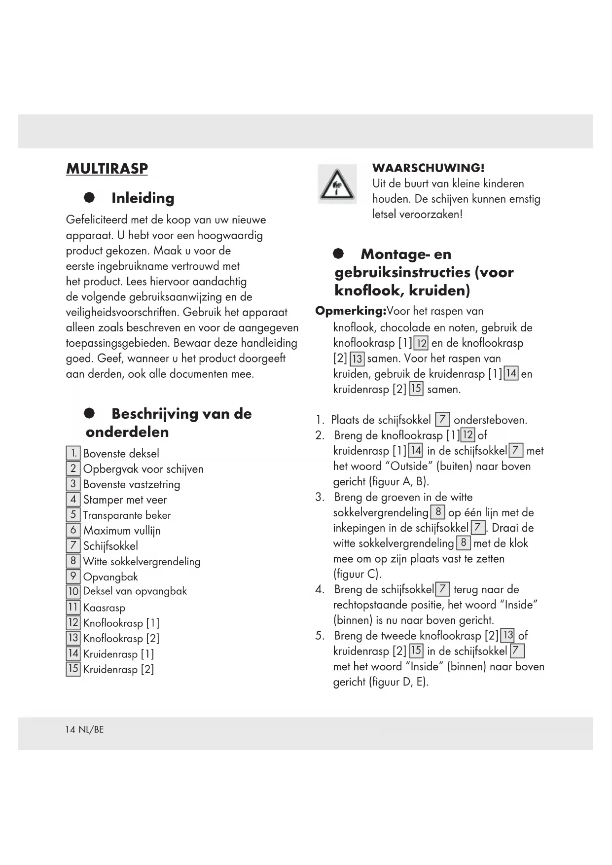 § Recyclage L’emballage se compose de matières recyclables qui peuvent être mises au rebut dans les déchetteries locales. Les possibilités de recyclage des produits usés sont à demander auprès de votre municipalité.14 NL/BE MULTIRASP § Inleiding Gefeliciteerd met de koop van uw nieuwe apparaat. U hebt voor een hoogwaardig product gekozen. Maak u voor de eerste ingebruikname vertrouwd met het product. Lees hiervoor aandachtig de volgende gebruiksaanwijzing en de veiligheidsvoorschriften. Gebruik het apparaat alleen zoals beschreven en voor de aangegeven toepassingsgebieden. Bewaar deze handleiding goed. Geef, wanneer u het product doorgeeft aan derden, ook alle documenten mee. § Beschrijving van de onderdelen