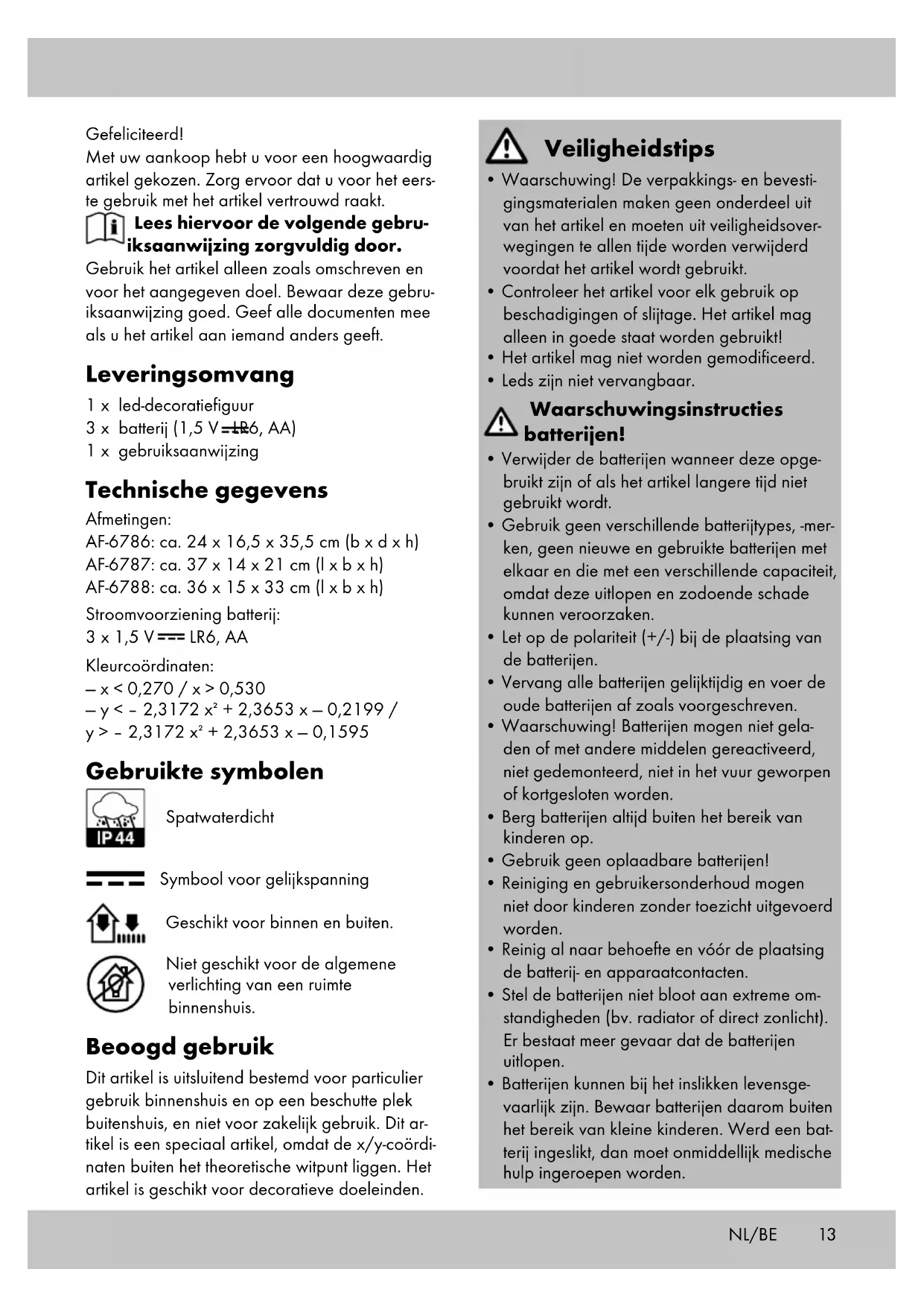 Batterijen wisselen Indien de batterijen (2) niet meer werken, kunt u deze vervangen. Ga hiervoor te werk zoals omschreven in het ge- deelte “Batterijen plaatsen“. Verwijder de oude batterijen uit het batterijvak voordat de nieuwe batterijen worden geplaatst. Licht in- en uitschakelen (afb. B) Druk één keer op de knop (1c) om de timerfunc- tie van het artikel te activeren. Aanwijzing: met de timerfunctie blijft het licht 6 uur lang aan en is daarna 18 uur lang uitgeschakeld. Het ritme herhaalt zich dagelijks. Druk twee keer op de knop (1c) om het artikel in te schakelen. Druk drie keer op de knop (1c) om het artikel uit te schakelen. Aanwijzing: afhankelijk van de geactiveerde modus hoeft u maar één keer op de knop te drukken om naar de volgende modus te gaan. Gebruik Het artikel kan binnenshuis of op een beschutte plek buitenshuis worden opgesteld. Aanwijzing: plaats het artikel niet op kwets- bare oppervlakken. Dit kan tot krassen leiden. Opslag, reiniging Bewaar het artikel wanneer u dit niet gebruikt altijd droog, schoon en zonder batterijen op kamertemperatuur. Reinig het artikel alleen met een vochtige schoonmaakdoek en droog het vervolgens af. BELANGRIJK! Reinig nooit met agressieve reini- gingsmiddelen. Afvalverwerking Gooi uw afgedankte artikel ter bescherming van het milieu niet bij het huisafval, maar breng het naar een erkende afvalinzamelaar. U kunt bij uw gemeente informeren naar inzamelpunten en hun openingstijden. Defecte of lege batterijen/accu’s moeten conform richtlijn 2006/66/EG en wijzigingen ervan worden gerecycled. Geef batterijen/ accu’s en/of het artikel terug via de aangeboden inzamelvoorzieningen. Geef verpakkingsmaterialen zoals foliezakjes niet aan kinderen. Berg het verpakkingsmateriaal buiten bereik van kinderen op. Milieuschade door verkeerde afvoer van batterijen/accu’s! Batterijen/accu’s mogen niet via het huisafval worden afgevoerd. Ze kunnen giftige zware metalen bevatten en moeten worden behandeld als klein chemisch afval. De chemische symbolen van de zware metalen zijn als volgt: Cd = cadmium, Hg = kwik, Pb = lood. Geef verbruikte batterijen/ accu’s daarom af bij een gemeentelijk inzamelpunt. NL/BE15 Voer het artikel en de verpakking op een milieuvriendelijke manier af. Neem de markering van verpakkingsma- terialen voor de afvalscheiding in acht. Deze zijn gemarkeerd met afkortingen (a) en nummers (b) met de volgende betekenis: