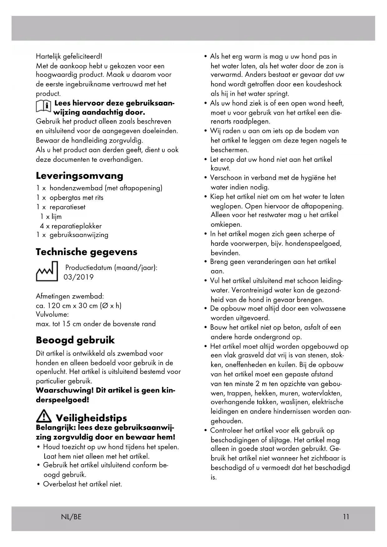 het artikel weer oppompt. Opslag, reiniging Verschoon het water in het artikel regelmatig, met name bij warm weer en wanneer het water vies is. Bewaar het artikel altijd droog en schoon op kamertemperatuur. Vouw het artikel alleen op en doe het alleen in de opbergtas als het volledig droog is. Zorg ervoor dat de aftapopening tijdens opslag altijd gesloten is. Reinig het artikel uitsluitend met water of mild zeepwater. Reinig nooit met agressieve schoonmaakmiddelen. Plaats tijdens de winteropslag geen scherpe voorwerpen op het artikel en poeder het artikel niet in met talkpoeder. Afvalverwerking Voer het artikel en verpakkingsmaterialen in overeenstemming met actuele lokale voor- schriften af. Verpakkingsmaterialen, zoals bv. foliezakjes, horen niet thuis in kinderhanden. Berg het verpakkingsmateriaal buiten het bereik van kinderen op. Voer de producten en verpakkingen op milieuvriendelijke wijze af. De recyclingcode dient om verschillende materialen te kenmerken ten behoeve van hergebruik via het recyclingproces. De code bestaat uit het recyclingsymbool, dat het recyclingproces weerspiegelt, en een getal dat het materiaal identificeert. NL/BE13NL/BE Opmerkingen over garantie en serviceafhandeling Het product is geproduceerd met grote zorg en onder voortdurende controle. U ontvangt een garantie van drie jaar op dit product, vanaf de datum van aankoop. Bewaar alstublieft uw aankoopbewijs. De garantie geldt alleen voor materiaal- en fa- bricagefouten en vervalt bij foutief of oneigenlijk gebruik. Uw wettelijke rechten, met name het garantierecht, worden niet beïnvloed door deze garantie. In geval van reclamaties dient u zich aan de beneden genoemde service-hotline te wenden of zich per e-mail met ons in verbinding te zetten. Onze servicemedewerkers zullen de verdere handelswijze zo snel mogelijk met u afspreken. Wij zullen u in ieder geval persoonlijk te woord staan. De garantieperiode wordt na eventuele repa- raties en op basis van de garantie, wettelijke garantie of coulance niet verlengd. Dit geldt ook voor vervangen en gerepareerde delen. Na afloop van de garantieperiode dienen even- tuele reparaties te worden betaald. IAN: 313411 Service België Tel.: 070 270 171 (0,15 EUR/Min.) E-Mail: deltasport@lidl.be Service Nederland Tel.: 0900 0400223 (0,10 EUR/Min.) E-Mail: deltasport@lidl.nl14 Gratulujemy! Przez Państwa zakup wybraliście produkt o wysokiej jakości. Przed pierwszym użyciem zapoznajcie się z produktem. W tym celu przeczytajcie następującą instrukcję obsługi. Z produktu należy korzystać jedynie jak to zostało opisane i w podanych zakresach zasto- sowania. Zachować niniejszą instrukcję. W razie przekazania produktu osobom trzecim dołączyć do niego wszystkie dokumenty. Zakres dostawy 1 x basen dla psa (z otworem spustowym) 1 x torba do przechowywania z zamkiem błyskawicznym 1 x zestaw naprawczy 1 x klej 4 x łatka do naprawy 1 x instrukcja obsługi Dane techniczne Data produkcji (miesiąc/rok): 03/2019 Wymiary basenu: ok. 120 cm x 30 cm (Ø x wys.) Pojemność: maks. do 15 cm poniżej górnej krawędzi Użytkowanie zgodne z prze- znaczeniem Ten produkt jest zaprojektowany jako basen dla psów i jest przeznaczony wyłącznie do użytku na zewnątrz. Produkt jest przeznaczony wyłącz- nie do użytku prywatnego. Ostrzeżenie! Produkt nie jest zabawką! Wskazówki bezpieczeń- stwa Ważne: należy uważnie przeczytać instrukcję obsługi i zachować ją do póź- niejszego użytku!