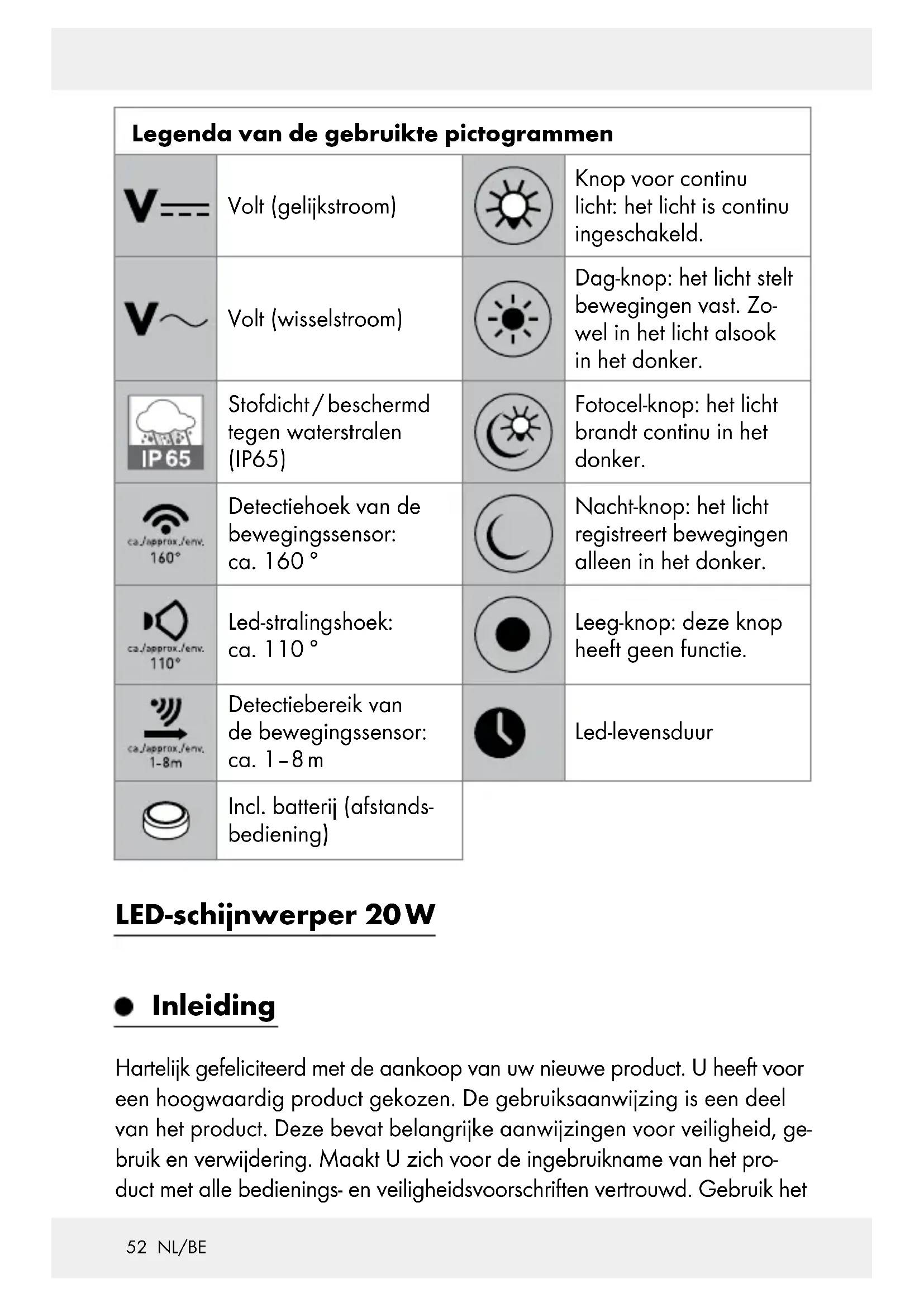 Veerring Technische gegevens Voedingsspanning: 230 V∼ 50 Hz Opgenomen vermogen: 20 W Verlichtingsmiddel (COB LED): 20 W (niet vervangbaar) Bewegingssensor: reikwijdte: max. 8 m (instelbaar), registratiehoek: ca. 160 ° horizontaal54 NL/BE Beschermingsklasse: I Beschermingsgraad: IP65 (stofdicht / beschermd tegen waterstralen) Gewicht: ca. 640 g Totale afmetingen: 18 x 12,5 x 8 cm Projectie-oppervlak: max. 18 x 12,5 cm Montagehoogte: ca. 1,8–2,5 m GS-gecertificeerd Afstandsbediening Voedingsspanning: 3 V Batterij: 1 x 3 V ; type: CR2025 lithium-batterij Reikwijdte: ca. 12 m van het product Omvang van de levering Controleer altijd direct na het uitpakken de levering op volledigheid en de optimale staat van het product. 1 LED-straler 2 pluggen (Ø 8 mm) 2 schroeven (Ø 5 x 50 mm) 1 houder 2 tandveerringen 2 onderlegplaatjes 2 veerringen 2 borgschroeven 1 klemafdekking 1 kabelwartel 1 afstandsbediening 1 lithium-batterij, type CR2025 (reeds geplaatst) 1 gebruiks aanwijzing55 NL/BE Algemene veiligheidsinstructies MAAK U VOOR DE EERSTE INGEBRUIKNAME VAN HET PRODUCT