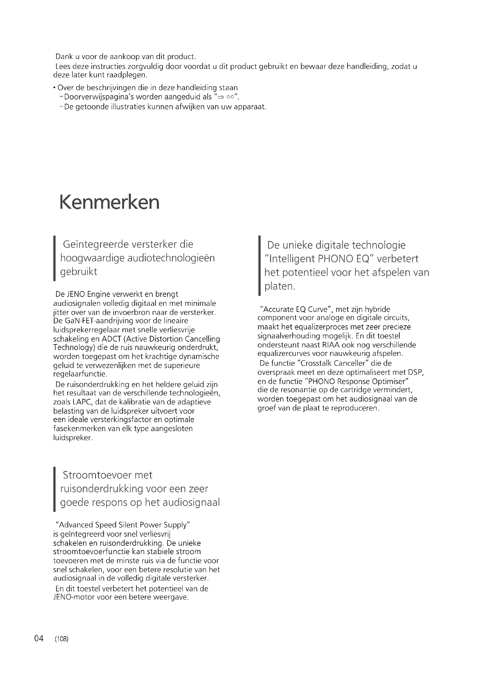 - Over de beschrijvingen die in deze handleiding staan - Doorverwijspagina’s worden aangeduid als “ ○○”. - De getoonde illustraties kunnen afwijken van uw apparaat. Geïntegreerde versterker die hoogwaardige audiotechnologieën gebruikt De JENO Engine verwerkt en brengt audiosignalen volledig digitaal en met minimale jitter over van de invoerbron naar de versterker. De GaN-FET-aandrijving voor de lineaire luidsprekerregelaar met snelle verliesvrije schakeling en ADCT (Active Distortion Cancelling Technology) die de ruis nauwkeurig onderdrukt, worden toegepast om het krachtige dynamische geluid te verwezenlijken met de superieure regelaarfunctie. De ruisonderdrukking en het heldere geluid zijn het resultaat van de verschillende technologieën, zoals LAPC, dat de kalibratie van de adaptieve belasting van de luidspreker uitvoert voor een ideale versterkingsfactor en optimale fasekenmerken van elk type aangesloten luidspreker. Stroomtoevoer met ruisonderdrukking voor een zeer goede respons op het audiosignaal “Advanced Speed Silent Power Supply” is geïntegreerd voor snel verliesvrij schakelen en ruisonderdrukking. De unieke stroomtoevoerfunctie kan stabiele stroom toevoeren met de minste ruis via de functie voor snel schakelen, voor een betere resolutie van het audiosignaal in de volledig digitale versterker. En dit toestel verbetert het potentieel van de JENO-motor voor een betere weergave. De unieke digitale technologie “Intelligent PHONO EQ” verbetert het potentieel voor het afspelen van platen. “Accurate EQ Curve”, met zijn hybride component voor analoge en digitale circuits, maakt het equalizerproces met zeer precieze signaalverhouding mogelijk. En dit toestel ondersteunt naast RIAA ook nog verschillende equalizercurves voor nauwkeurig afspelen. De functie “Crosstalk Canceller” die de overspraak meet en deze optimaliseert met DSP, en de functie “PHONO Response Optimiser” die de resonantie op de cartridge vermindert, worden toegepast om het audiosignaal van de groef van de plaat te reproduceren. KenmerkenNederlands