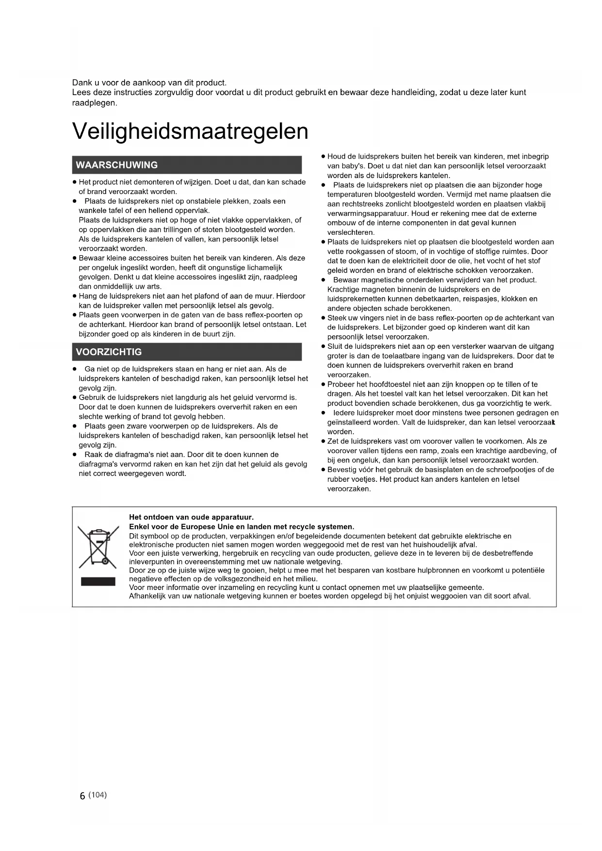 worden. ≥ Zet de luidsprekers vast om voorover vallen te voorkomen. Als ze voorover vallen tijdens een ramp, zoals een krachtige aardbeving, of bij een ongeluk, dan kan persoonlijk letsel veroorzaakt worden. ≥ Bevestig vóór het gebruik de basisplaten en de schroefpootjes of de rubber voetjes. Het product kan anders kantelen en letsel veroorzaken. WAARSCHUWING VOORZICHTIG Het ontdoen van oude apparatuur. Enkel voor de Europese Unie en landen met recycle systemen. Dit symbool op de producten, verpakkingen en/of begeleidende documenten betekent dat gebruikte elektrische en elektronische producten niet samen mogen worden weggegooid met de rest van het huishoudelijk afval. Voor een juiste verwerking, hergebruik en recycling van oude producten, gelieve deze in te leveren bij de desbetreffende inleverpunten in overeenstemming met uw nationale wetgeving. Door ze op de juiste wijze weg te gooien, helpt u mee met het besparen van kostbare hulpbronnen en voorkomt u potentiële negatieve effecten op de volksgezondheid en het milieu. Voor meer informatie over inzameling en recycling kunt u contact opnemen met uw plaatselijke gemeente. Afhankelijk van uw nationale wetgeving kunnen er boetes worden opgelegd bij het onjuist weggooien van dit soort afval. (104) SB-G90M2_TQBM0786_E_mst.book 6 ページ 2021年8月3日 火曜日 午後2時40分Nederlands