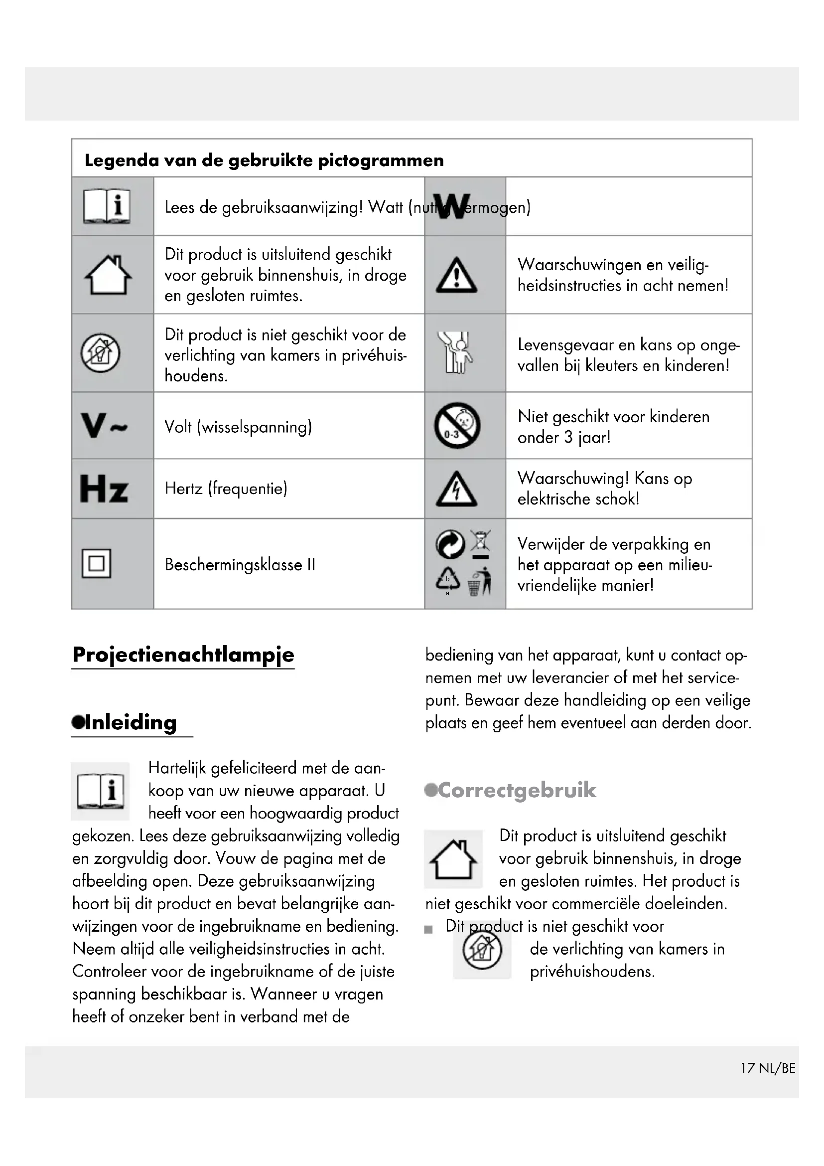 Verwijder de verpakking en het apparaat op een milieu- vriendelijke manier! Projectienachtlampje Inleiding Hartelijk gefeliciteerd met de aan- koop van uw nieuwe apparaat. U heeft voor een hoogwaardig product gekozen. Lees deze gebruiksaanwijzing volledig en zorgvuldig door. Vouw de pagina met de afbeelding open. Deze gebruiksaanwijzing hoort bij dit product en bevat belangrijke aan- wijzingen voor de ingebruikname en bediening. Neem altijd alle veiligheidsinstructies in acht. Controleer voor de ingebruikname of de juiste spanning beschikbaar is. Wanneer u vragen heeft of onzeker bent in verband met de bediening van het apparaat, kunt u contact op- nemen met uw leverancier of met het service- punt. Bewaar deze handleiding op een veilige plaats en geef hem eventueel aan derden door. Correct gebruik Dit product is uitsluitend geschikt voor gebruik binnenshuis, in droge en gesloten ruimtes. Het product is niet geschikt voor commerciële doeleinden. Dit product is niet geschikt voor de verlichting van kamers in privéhuishoudens.18 NL/BE Beschrijving van de onderdelen