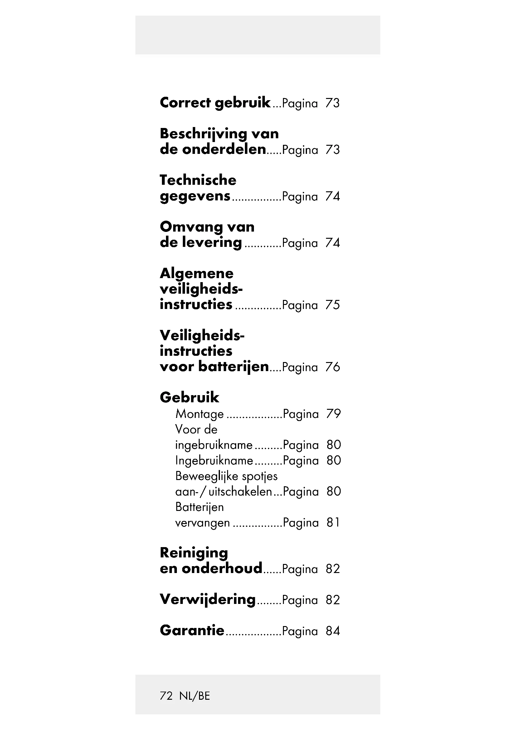Kinderen mogen niet met het apparaat spelen. Rei- niging en76 NL/BE gebruikersonderhoud mo- gen niet door kinderen zonder toezicht worden uitgevoerd. Gebruik uw lamp nooit, als u een beschadiging hebt vastgesteld. LEDs kunnen niet worden vervangen. De lamp is uitsluitend be- doeld voor het gebruik binnenshuis, in droge en gesloten ruimtes. Veiligheids- instructies voor batterijen WAARSCHU- WING! LEVENSGE- VAAR! Houd batterijen uit de buurt van kinderen. Laat batterijen niet rond- slingeren. Hier bestaat het gevaar dat deze door kin- deren of huisdieren worden ingeslikt. Raadpleeg bij77 NL/BE inslikken onmiddellijk een arts. EXPLOSIEGE- VAAR! Laad niet-oplaadbare batterijen nooit op, sluit ze niet kort en / of open ze niet. EXPLOSIEGE- VAAR! Gooi batterijen nooit in vuur of water. De batte- rijen kunnen exploderen. Houd batterijen uit de buurt van kinderen, gooi batte- rijen niet in het vuur, sluit ze niet kort en neem ze niet uit elkaar. Vermijd het contact met de huid, ogen en slijmvliezen. Spoel in geval van contact met batterijzuur de dien- overeenkomstige plekken af met voldoende schoon water en raadpleeg onmiddellijk een arts. Reinig de contacten van het product en van de batterijen zonodig voor- dat u de batterijen plaatst.78 NL/BE Let bij het plaatsen van de batterijen op de juiste polariteit! Deze staat in het batterijvak. Gebruik alleen batterijen van hetzelfde type. Verwijder de batterijen uit het apparaat als het gedu- rende een langere periode niet wordt gebruikt. Verwijder verbruikte batte- rijen direct uit het apparaat. Er is sprake van verhoogd gevaar op lekkage! Vermijd extreme omstan- digheden en temperaturen die op de batterijen in zouden kunnen werken, bijv. door radiatoren. An- ders bestaat gevaar voor lekkage. Bij negeren van de veilig- heidsinstructies kunnen batterijen over hun eind- spanning heen ontladen worden. In dat geval bestaat het gevaar dat ze gaan lekken. Lekken de batterijen in uw apparaat, verwijder ze dan79 NL/BE direct om schade aan het apparaat te vermijden! Batterijen horen niet thuis bij het huisvuil! Iedere verbruiker is wette- lijk verplicht, batterijen volgens de voorschriften af te voeren. Gebruik Montage Bevestig de montageplaat