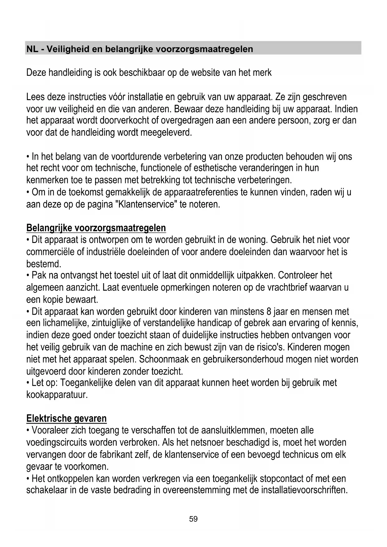 - Let op: Toegankelijke delen van dit apparaat kunnen heet worden bij gebruik met kookapparatuur. Elektrische gevaren