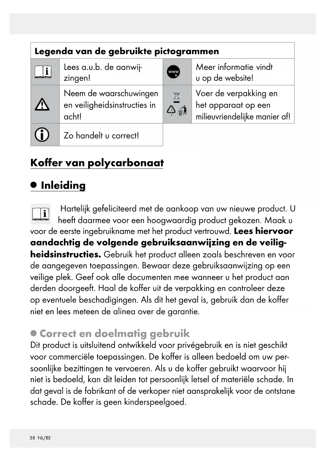 Voer de verpakking en het apparaat op een milieuvriendelijke manier af! Zo handelt u correct! Koffer van polycarbonaat Inleiding Hartelijk gefeliciteerd met de aankoop van uw nieuwe product. U heeft daarmee voor een hoogwaardig product gekozen. Maak u voor de eerste ingebruikname met het product vertrouwd. Lees hiervoor aandachtig de volgende gebruiksaanwijzing en de veilig- heidsinstructies. Gebruik het product alleen zoals beschreven en voor de aangegeven toepassingen. Bewaar deze gebruiksaanwijzing op een veilige plek. Geef ook alle documenten mee wanneer u het product aan derden doorgeeft. Haal de koffer uit de verpakking en controleer deze op eventuele beschadigingen. Als dit het geval is, gebruik dan de koffer niet en lees meteen de alinea over de garantie. Correct en doelmatig gebruik Dit product is uitsluitend ontwikkeld voor privégebruik en is niet geschikt voor commerciële toepassingen. De koffer is alleen bedoeld om uw per- soonlijke bezittingen te vervoeren. Als u de koffer gebruikt waarvoor hij niet is bedoeld, kan dit leiden tot persoonlijk letsel of materiële schade. In dat geval is de fabrikant of de verkoper niet aansprakelijk voor de ontstane schade. De koffer is geen kinderspeelgoed.39 NL/BE Beschrijving van de onderdelen
