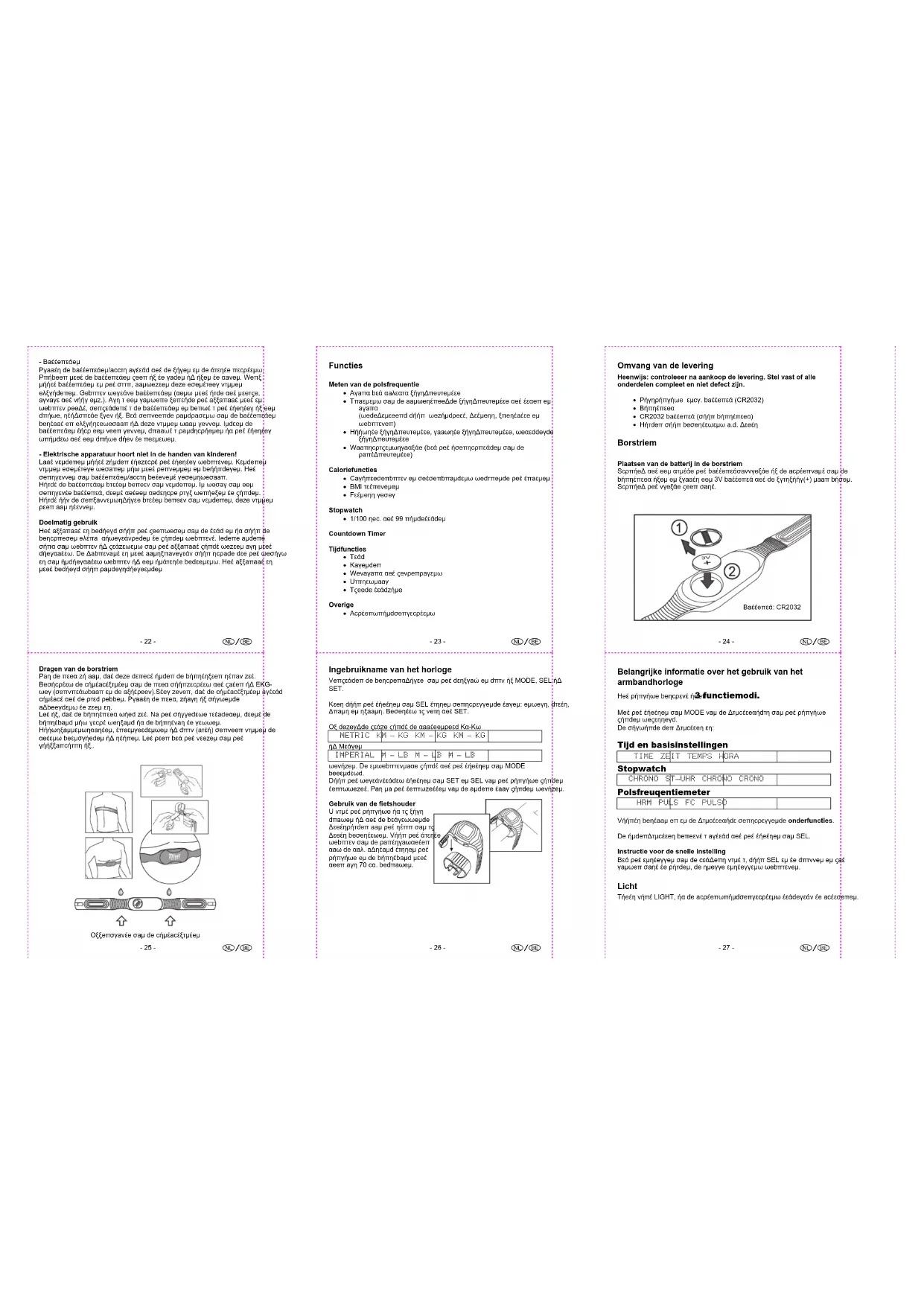 Gecodeerde overdracht van de hartfrequentie Het overdragen van de data van de borstband word wordt digitaal gecodeerd, om te verhinderen dat er storingen optreden als u met een traininspartner traint, die een soortgelijk apparaat gebruikt. Bij het eerstmalige gebruik van de borstband wordt automatisch een toevallig kanaal gekozen. Dit kanaal wordt kort op het display weergegeven, als u naar de weergave van de hartfrequentie wisselt. Volgende kanalen staan ter beschikking: CH10, CH 11, CH 12, CH13 en CH14. U kunt van kanaal wisselen, indien u de batterij kort uit de borstband verwijdert en dan weer terugzet. De borstband kiest naar het toevalprincipe weer een nieuw kanaal en na ca. 1 minuut worden de polsfrquentie en het nieuwe kanaal op het horloge weergegeven. Verhelpen van storingen De polsfrequentie wordt niet- of niet juist aangegeven Let op het juiste aanbrengen en goede positie van de borstriem. Uw huid mag niet te droog of te koud zijn. De contactpunten kunnen voorzichtig bevochtigt worden om de werking te verbeteren. Electromagnetische storingen kunnen de ontvangst beinvloeden. De afstand tussen borstriem en polshorloge mag max. 60 cm. bedragen Andere apparatuur voor het meten van de polsfrequentie op minder dan 2 m. afstand, kan de ontvangst storen Draadloze fietscomputer kunnen de ontvangst storen. Evtl. moeten de batterijen worden vervangen. Het display is slecht afleesbaar/De verlichting werkt niet Vervang de batterijen