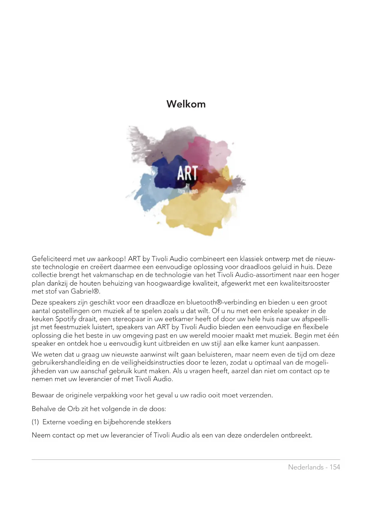 - Veelgestelde vragen Nederlands - 154 Welkom Gefeliciteerd met uw aankoop! ART by Tivoli Audio combineert een klassiek ontwerp met de nieuw- ste technologie en creëert daarmee een eenvoudige oplossing voor draadloos geluid in huis. Deze collectie brengt het vakmanschap en de technologie van het Tivoli Audio-assortiment naar een hoger plan dankzij de houten behuizing van hoogwaardige kwaliteit, afgewerkt met een kwaliteitsrooster met stof van Gabriel®. Deze speakers zijn geschikt voor een draadloze en bluetooth®-verbinding en bieden u een groot aantal opstellingen om muziek af te spelen zoals u dat wilt. Of u nu met een enkele speaker in de keuken Spotify draait, een stereopaar in uw eetkamer heeft of door uw hele huis naar uw afspeelli- jst met feestmuziek luistert, speakers van ART by Tivoli Audio bieden een eenvoudige en flexibele oplossing die het beste in uw omgeving past en uw wereld mooier maakt met muziek. Begin met één speaker en ontdek hoe u eenvoudig kunt uitbreiden en uw stijl aan elke kamer kunt aanpassen. We weten dat u graag uw nieuwste aanwinst wilt gaan beluisteren, maar neem even de tijd om deze gebruikershandleiding en de veiligheidsinstructies door te lezen, zodat u optimaal van de mogeli- jkheden van uw aanschaf gebruik kunt maken. Als u vragen heeft, aarzel dan niet om contact op te nemen met uw leverancier of met Tivoli Audio. Bewaar de originele verpakking voor het geval u uw radio ooit moet verzenden. Behalve de Orb zit het volgende in de doos: (1) Externe voeding en bijbehorende stekkers Neem contact op met uw leverancier of Tivoli Audio als een van deze onderdelen ontbreekt.Nederlands - 155 Handleiding van de mogelijkheden Voorzijde Tivoli Audio LOGO: Dit is een aanraakgevoelige bediening onder het hout. In de draadloze mo- dus pauzeert/start de knop het streamen van de muziek. In de bluetooth-modus dempt de knop de speaker. Handleiding van de mogelijkhedenNederlands - 156 Onderste paneel A. POWER: Druk om het apparaat aan te zetten. Houd ingedrukt om hem uit te zetten. B. SETUP: Druk om uw speaker te laten verbinden met uw thuisnetwerk. C. ADD/DROP: Als de speaker met een groep verbonden is, wordt hij uit de groep verwijderd als u deze knop ingedrukt houdt. Als de speaker niet met een groep verbonden is, wordt hij met de vol- gende beschikbare groep verbonden als u op deze knop drukt. Kijk voor meer informatie in het hoofdstuk ‘Add/Drop’ van deze handleiding. D. PARTY MODE: Houd ingedrukt om muziek vanaf deze speaker naar alle andere verbonden speakers te verzenden. Kijk voor meer informatie in het hoofdstuk ‘Party Mode’ van deze handleiding. E. SOURCE: Tik om van geluidsbron te wisselen. De geluidsbron wordt aangegeven met de kleur van het ledlampje. Om de verbindingsstand in te schakelen in de bluetooth-modus houdt u deze knop een seconde ingedrukt als het lampje al knippert, of als het lampje continu brandt, totdat het lampje gaat knipperen. Groen ledlampje – Draadloze modus Blauw ledlampje – Modus voor streamen via Bluetooth Paars ledlampje – Aux-modus F. VOLUME -: Druk om het geluidsvolume zachter te zetten. G. VOLUME +: Druk om het geluidsvolume harder te zetten. H. DC Power: Sluit de Tivoli-oplader aan om uw batterij op te laden of uw speaker van elektriciteit te voorzien. Gebruik uitsluitend de oplader die bij dit product geleverd wordt. p. 176