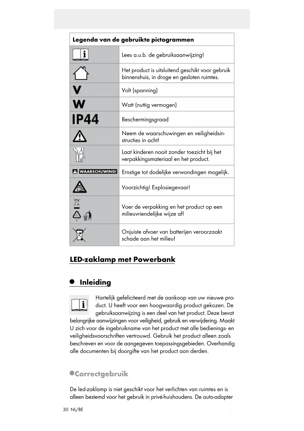 bij 5 V 2,0–2,1 A Led: 3 W CREE XPE-R2 3 verlichtings-modi: 100 %, 30 %, SOS Lichtsterkte: ca. 120 lumen Beschermingsgraad: IP44 (alleen met afdekking) USB-laadvermogen: Ingangsvermogen: 5 V, 1 A Uitgangsvermogen: 5 V, 2,1 A Auto-adapter: Modelnr.: BE24L-100-050 Ingangsvermogen: 12–24 V Uitgangsvermogen: 5 V, 1 A Ingebouwde zekering: T 2 A 250 V, 6 x 30 mm32 NL/BE Veiligheidsinstructies LEES VOOR HET GEBRUIK ALSTUBLIEFT DE GEBRUIKSAANWIJ-