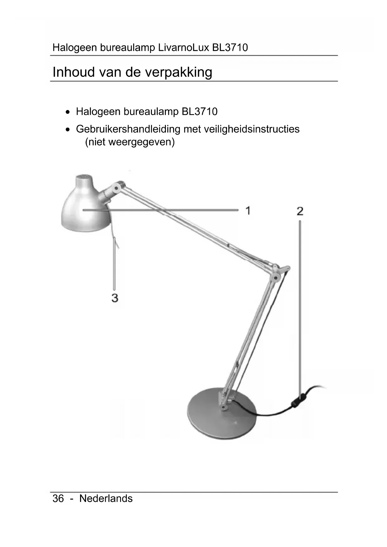 De halogeen bureau tafellamp BL3710 kan als lamp voor uw bureau worden gezruikt. Met de flexibile armkest u de lamp aanpassen aan uw wensen. Plaats de lamp.altijd op een vlakke, stabiele plaats.