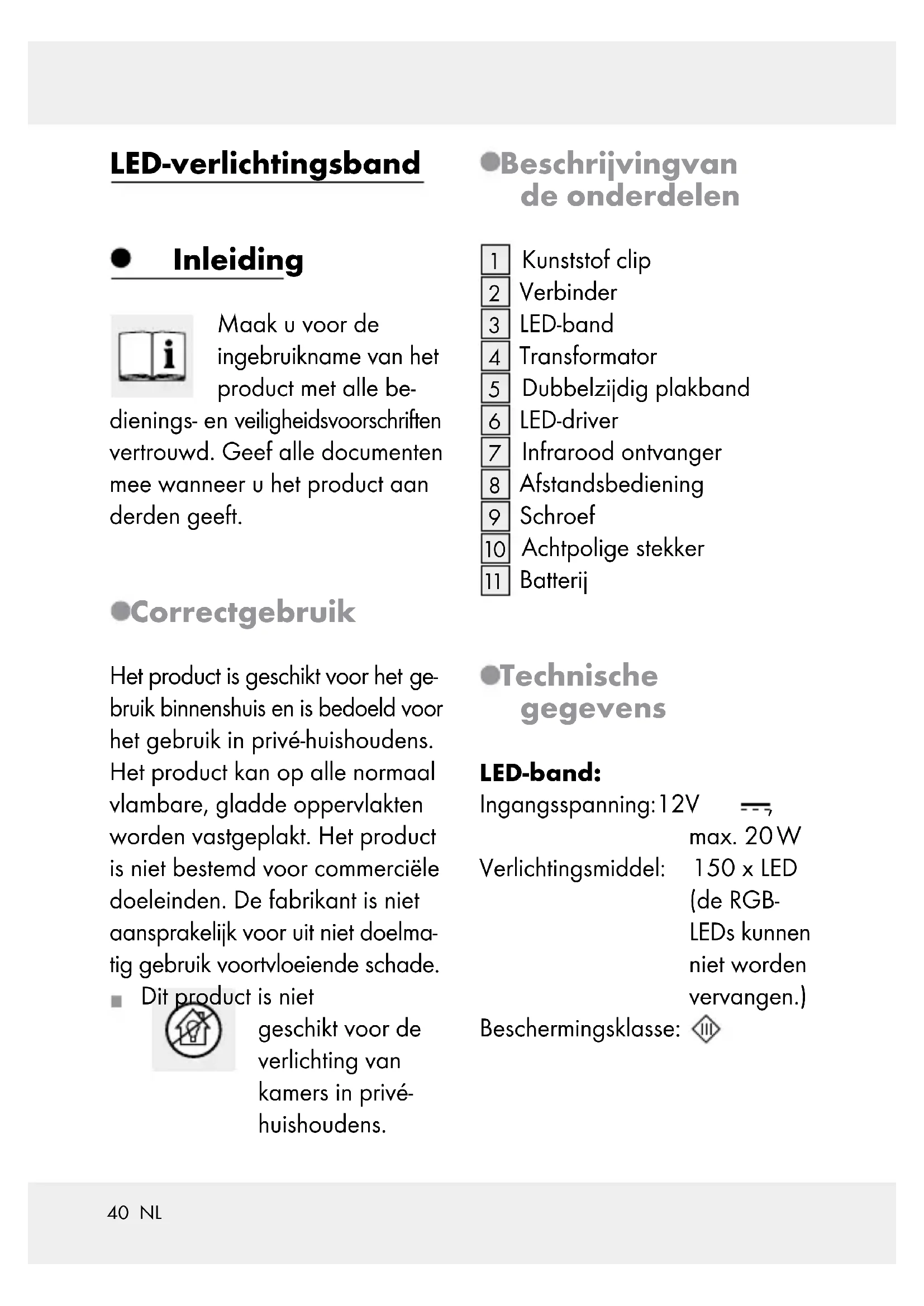 (5,45 mm laagvolt- stekker) Beschermingsklasse: Modelnr.: T862-i24 Infraroodbediening: Batterij: 3 V lithium-bat- terij, type CR2025 Max. reikwijdte: ca. 6–8 m Inhoud van de levering 1 LED-band 1 LED-driver 1 dubbelzijdig plakband 1 transformator 4 korte verbinders ( 10 cm) 4 lange verbinders (50 cm) 1 afstandsbediening 1 lithium-batterij 16 kunststof clips 2 schroeven 1 achtpolige stekker 1 gebruiksaanwijzing Veiligheids- instructies
