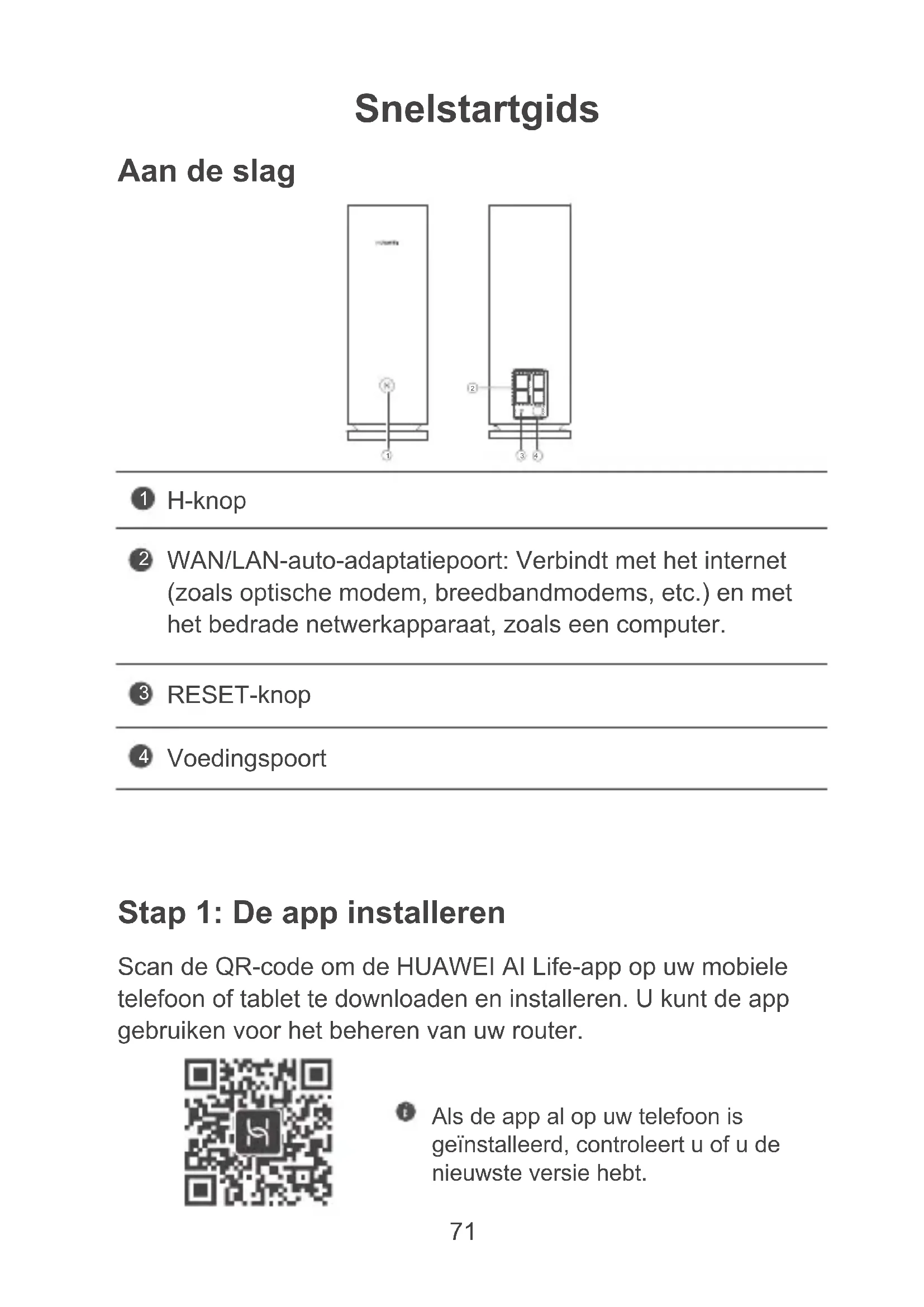 RESET-knop WAN/LAN-auto-adaptatiepoort: Verbindt met het internet (zoals optische modem, breedbandmodems, etc.) en met het bedrade netwerkapparaat, zoals een computer. Voedingspoort H-knop Scan de QR-code om de HUAWEI AI Life-app op uw mobiele telefoon of tablet te downloaden en installeren. U kunt de app gebruiken voor het beheren van uw router. Stap 1: De app installeren Als de app al op uw telefoon is geïnstalleerd, controleert u of u de nieuwste versie hebt.