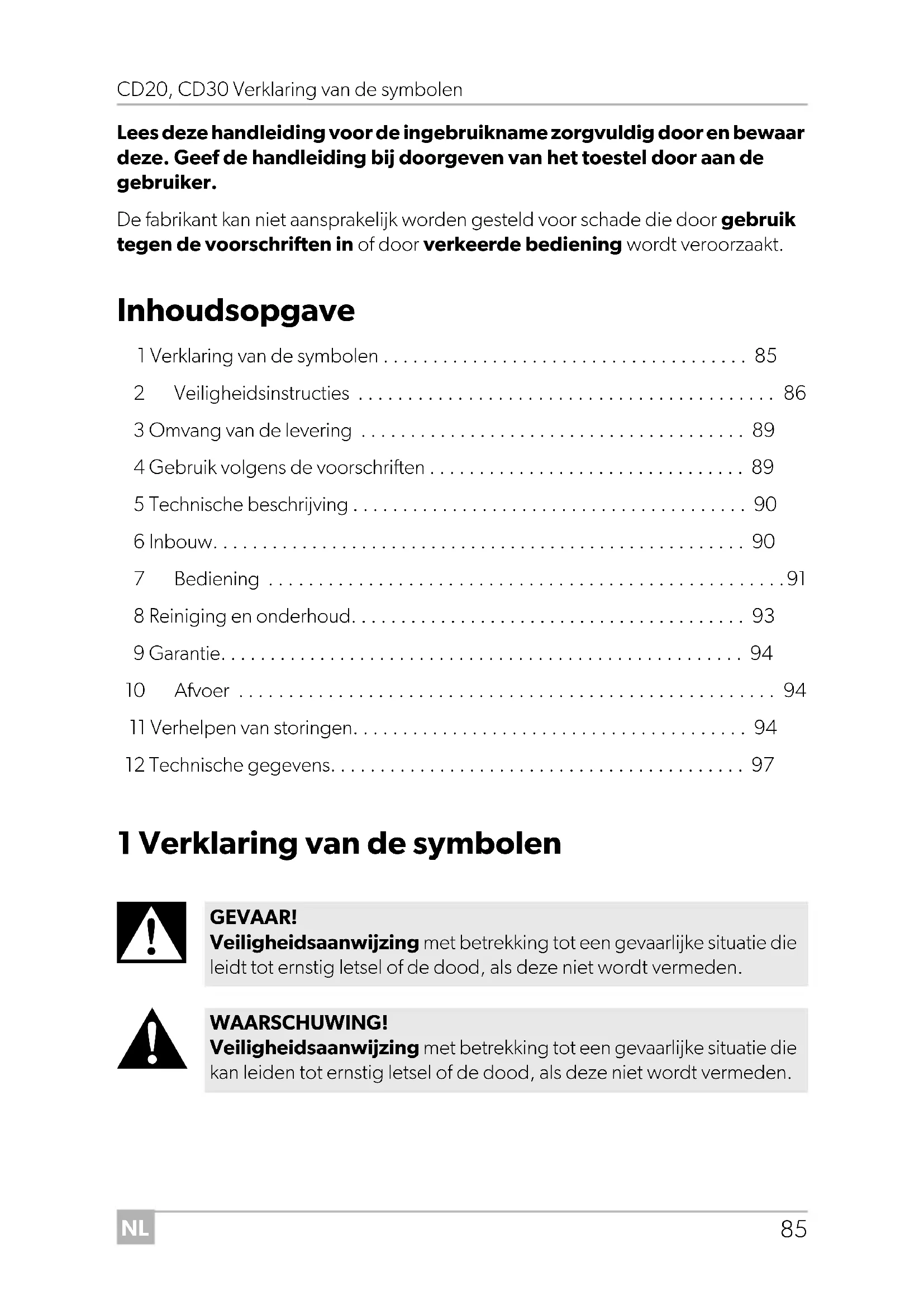 - Lees deze handleiding voor de ingebruikname zorgvuldig door en bewaar deze. Geef de handleiding bij doorgeven van het toestel door aan de gebruiker. De fabrikant kan niet aansprakelijk worden gesteld voor schade die door gebruik tegen de voorschriften in of door verkeerde bediening wordt veroorzaakt. Inhoudsopgave 1 Verklaring van de symbolen p. 85