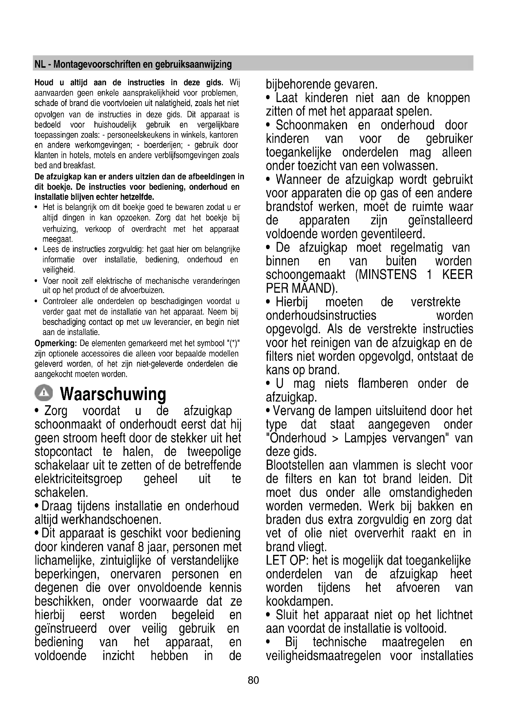 - De afzuigkap moet regelmatig van binnen en van buiten worden schoongemaakt (MINSTENS 1 KEER PER MAAND).