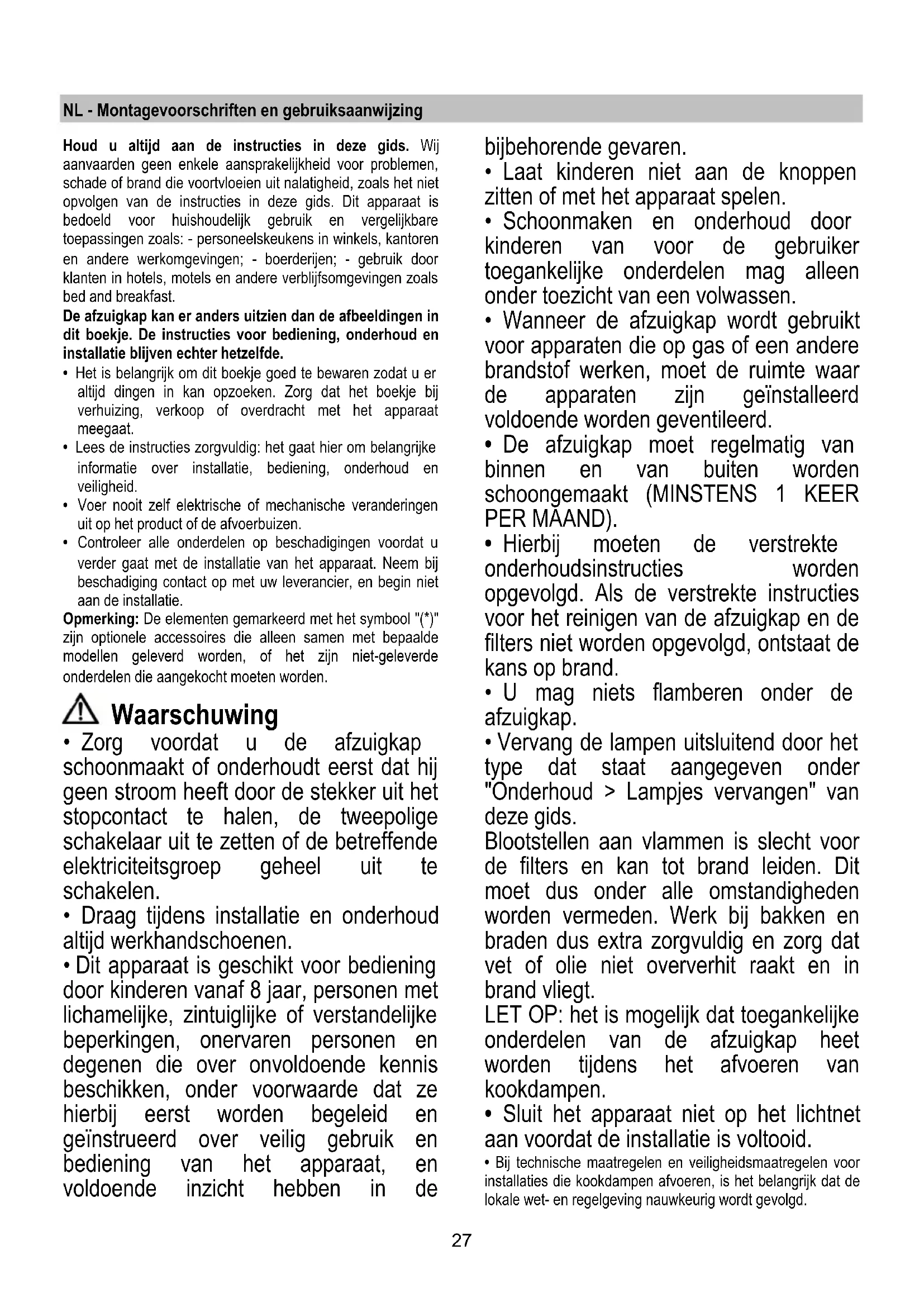 - De afzuigkap moet regelmatig van binnen en van buiten worden schoongemaakt (MINSTENS 1 KEER PER MAAND).