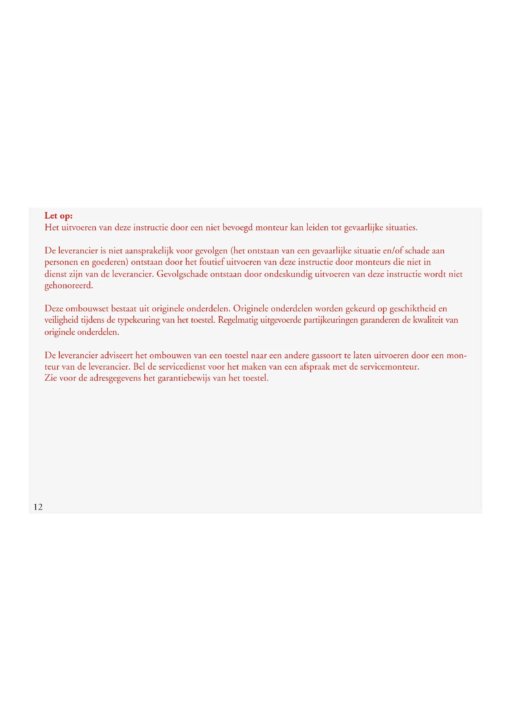 Let op: Het uitvoeren van deze instructie door een niet bevoegd monteur kan leiden tot gevaarlijke situaties. De leverancier is niet aansprakelijk voor gevolgen (het ontstaan van een gevaarlijke situatie en/of schade aan personen en goederen) ontstaan door het foutief uitvoeren van deze instructie door monteurs die niet in dienst zijn van de leverancier. Gevolgschade ontstaan door ondeskundig uitvoeren van deze instructie wordt niet gehonoreerd. Deze ombouwset bestaat uit originele onderdelen. Originele onderdelen worden gekeurd op geschiktheid en veiligheid tijdens de typekeuring van het toestel. Regelmatig uitgevoerde partijkeuringen garanderen de kwaliteit van originele onderdelen. De leverancier adviseert het ombouwen van een toestel naar een andere gassoort te laten uitvoeren door een mon- teur van de leverancier. Bel de servicedienst voor het maken van een afspraak met de servicemonteur. Zie voor de adresgegevens het garantiebewijs van het toestel.13 Inleiding Met deze ombouwset bouwt u uw gaskookplaat om van aardgas (G20/G25) op propaan-/butaangas. Controleer voordat u met ombouwen begint of uw gaskookplaat daadwerkelijk op aardgas is ingesteld. Gereedschap A. Pijp- (of dopsleutel) 7 B. Schroevendraaier 4 mm (bladbreedte) C. Torx-20 schroevendraaier D. Punttang E. Lekspray en/of speciale drukmeter F. Steeksleutel 7+10 (Wok) G. Isolatieplaatje wok Let op: Test het toestel na het ombouwen op gasdichtheid (zie hoofdstuk 3). Vervang de volgende onderdelen: - spuitstukken voor de branders - spaarstandschroeven voor de gaskranen - afdichtringen voor de afdichting onder de branders - schroeven voor vastzetten branderkelk/vangschaal op brander - 3 gegevensplaatjes met gewijzigde gasinstelling - 3 fiberringen onder de schroeven wokbrander De waarden van de spuitstukken en spaarstandschroeven vindt u, ter verificatie, op de stickers van de sets. De letters van de sets (hoofdletter voor spuitstukken en kleine letter voor spaarstandstiften) corresponderen met de letters op de sticker op de onderbakbodem van het toestel. De waarden staan ook op de inspuiters en spaarstandstiften. De volgende sets kunnen voorkomen: - Set ‘A-a’ voor sudderbrander - Set ‘B-b’ voor normaalbrander - Set ‘C-c’ voor sterkbrander - Set ‘G1-g’,’G2’ en ‘G3’ voor wokbrander (‘g’ voor spaarstandschroef)