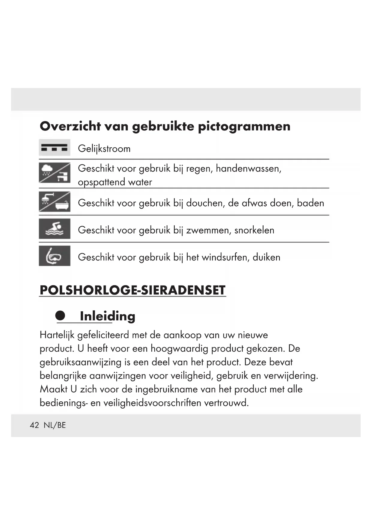 (afb. F). Haal de oude stift voorzichtig uit de schuiver met behulp van een tang (afb. G). Gebruik nogmaals de tang om de reservestift voorzichtig in de schuiver te brengen. De nieuwe stift is geïnstalleerd. Reiniging en onderhoud Maak alleen de buitenkant van het product schoon met een schoon, zacht en vochtig doekje. Spoel het product, indien nodig, onder de kraan af. Droog het product na het afspoelen goed.49 NL/BE Verwijdering De verpakking bestaat uit milieuvriendelijke grondstoffen die u via de plaatselijke recyclingcontainers kunt afvoeren. De Grüne Punkt geldt niet voor Duitsland. Neem de aanduiding van de verpakkingsmaterialen voor de afvalscheiding in acht. Deze zijn gemarkeerd met de afkortingen (a) en een cijfers (b) met de volgende betekenis: 1–7: kunststoffen / 20–22: papier en vezelplaten / 80–98: composietmaterialen. Het product en de verpakkingsmaterialen zijn recyclebaar; verwijder deze afzonderlijk voor een betere afvalbehandeling. Het Triman-logo geldt alleen voor Frankrijk. Informatie over de mogelijkheden om het uitgediende product na gebruik te verwijderen, verstrekt uw gemeentelijke overheid.50 NL/BE Gooi het afgedankte product omwille van het milieu niet weg via het huisvuil, maar geef het af bij het daarvoor bestemde depot of het gemeentelijke milieupark. Over afgifteplaatsen en hun openingstijden kunt u zich bij uw aangewezen instantie informeren. Defecte of gebruikte batterijen / oplaadbare batterijen moeten volgens de richtlijn 2006/66/EG en diens wijzigingen worden gerecycled. Lever de batterijen / oplaadbare batterijen en / of het product in bij een erkend inzamelpunt. Milieuschade door verkeerde afvoer van batterijen / oplaadbare batterijen! Batterijen / oplaadbare batterijen mogen niet samen met het gewone huisvuil worden weggegooid. Ze kunnen giftig zwaar metaal bevatten en moeten worden behandeld als gevaarlijk afval. De chemische symbolen van de zware metalen zijn als volgt: Cd = cadmium, Hg = kwikzilver, Pb = lood. Lever uw gebruikte batterijen / oplaadbare batterijen aldus in bij een gemeentelijk inzamelpunt.51 NL/BE Garantie Het product wordt volgens strenge kwaliteitsrichtlijnen zorgvuldig geproduceerd en voor levering grondig getest. In geval van schade aan het product kunt u rechtmatig beroep doen op de verkoper van het product. Deze wettelijke rechten worden door onze hierna vermelde garantie niet beperkt. Op dit product verlenen wij 3 jaar garantie vanaf aankoopdatum. De garantieperiode start op de dag van aankoop. Bewaar de originele kassabon alstublieft. Dit document is nodig als bewijs voor aankoop. Wanneer binnen 3 jaar na de aankoopdatum van dit product een materiaal- of productiefout optreedt, dan wordt het product door ons – naar onze keuze – gratis voor u gerepareerd of vervangen. Deze garantie komt te vervallen als het product beschadigd wordt, niet correct gebruikt of onderhouden wordt.52 NL/BE De garantie geldt voor materiaal- en productiefouten. Deze garantie is niet van toepassing op productonderdelen, die onderhevig zijn aan normale slijtage en hierdoor als aan slijtage onderhevige onderdelen gelden (bijv. batterijen) of voor beschadigingen aan breekbare onderdelen, zoals bijv. schakelaars, accu’s of dergelijke onderdelen, die gemaakt zijn van glas. Het verminderen van de waterdichtheid valt eveneens niet onder de garantie. De toestand van de waterdichtheid is geen voortdurende eigenschap en dient daarom regelmatig onderhouden te worden. Houd er alstublieft rekening mee, dat door het openen en repareren van uw horloge door personen, die hiertoe niet gemachtigd zijn, uw garantie komt te vervallen.53 CZ Seznam použitých piktogramů.................Strana 54 Úvod..........................................Strana 54 Používání v souladu s určením ....................Strana 55 Popis částí.....................................Strana 55 Technická data ................................Strana 56 Rozsah dodávky ..............................Strana 56 Příprava k použití produktu ...................Strana 57 Výměna baterie ...............................Strana 57 Nastaveníčasu ................................Strana 57 Vodotěsnost...................................Strana 58 Zkrácení náramku hodinek ....................Strana 58 Model č.: HG03031A / HG03031C .............Strana 58 Model č.: HG03031E..........................Strana 58 Odejmutí segmentů (obr. D)......................Strana 59 Jak se vyměňuje osička v po souvátku (obr. E, F, G) ...Strana 60 Čištění a údržba ...............................Strana 60 Odstranění do odpadu.........................Strana 61 Záruka........................................Strana 6354 CZ Seznam použitých piktogramů Stejnosměrný proud Vhodné k používání v dešti, při mytí rukou, ve stříkající vodě Vhodné k používání při sprchování, oplachování, koupání Vhodné k používání při plavání, šnorchlování Vhodné pro používání při windsurfingu, potápění