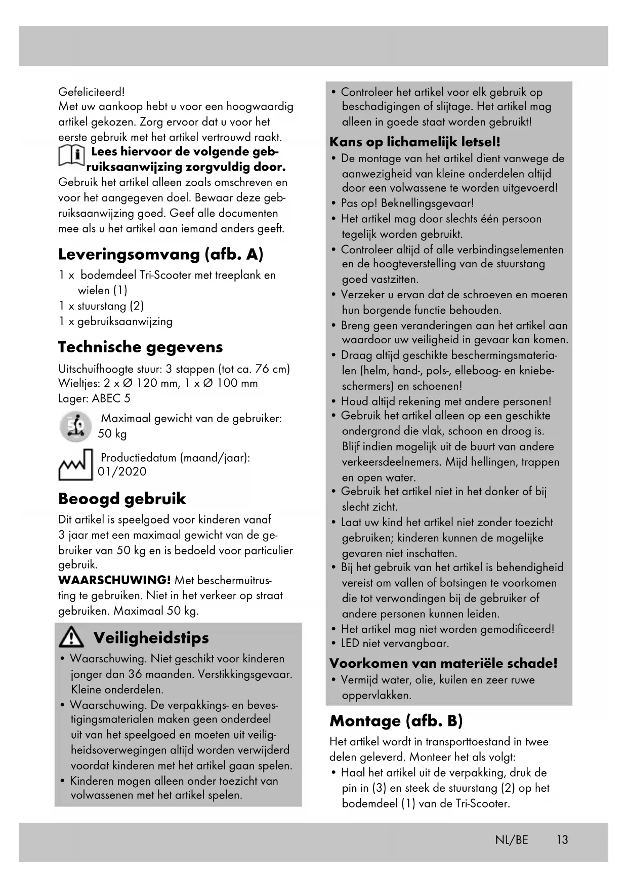 met de bouten. Na het vervangen: Verzeker u ervan dat alle bouten na de eerste minuten rijden nog steeds vastzitten en er niets is losgeraakt of versoepeld. Draai de wielbouten nog eens aan om zeker te stellen dat ze goed vastzitten. Opslag, reiniging Het wordt aanbevolen het artikel na gebruik grondig met water te reinigen en te laten drogen. Verwijder kleine steentjes of andere voorwer- pen die eventueel aan de wieltjes zijn blijven hangen. Bewaar het artikel wanneer u dit niet gebruikt altijd droog en schoon op kamertemperatuur. Reinig het artikel alleen met water en veeg het vervolgens droog. BELANGRIJK! Reinig nooit met agressieve reini- gingsmiddelen. Afvalverwerking Voer het artikel en verpakkingsmaterialen in overeenstemming met actuele lokale voor- schriften af. Verpakkingsmaterialen, zoals bv. foliezakjes, horen niet thuis in kinderhanden. Berg het verpakkingsmateriaal buiten het bereik van kinderen op. NL/BE15NL/BE Voer de producten en verpakkingen op milieuvriendelijke wijze af. De recyclingcode dient om verschillende materialen te kenmerken ten behoeve van hergebruik via het recyclingproces. De code bestaat uit het recyclingsymbool, dat het recyclingproces weerspiegelt, en een getal dat het materiaal identificeert. Opmerkingen over garantie en serviceafhandeling Het product is geproduceerd met grote zorg en onder voortdurende controle. U ontvangt een garantie van drie jaar op dit product, vanaf de datum van aankoop. Bewaar alstublieft uw aankoopbewijs. De garantie geldt alleen voor materiaal- en fa- bricagefouten en vervalt bij foutief of oneigenlijk gebruik. Uw wettelijke rechten, met name het garantierecht, worden niet beïnvloed door deze garantie. In geval van reclamaties dient u zich aan de beneden genoemde service-hotline te wenden of zich per e-mail met ons in verbinding te zetten. Onze servicemedewerkers zullen de verdere han- delswijze zo snel mogelijk met u afspreken. Wij zullen u in ieder geval persoonlijk te woord staan. De garantieperiode wordt na eventuele repa- raties en op basis van de garantie, wettelijke garantie of coulance niet verlengd. Dit geldt ook voor vervangen en gerepareerde delen. Na afloop van de garantieperiode dienen even- tuele reparaties te worden betaald. IAN: 331258_1907 Service België Tel.: 070 270 171 (0,15 EUR/Min.) E-Mail: deltasport@lidl.be Service Nederland Tel.: 0900 0400223 (0,10 EUR/Min.) E-Mail: deltasport@lidl.nl16 DE/AT/CH Herzlichen Glückwunsch! Mit Ihrem Kauf haben Sie sich für einen hoch- wertigen Artikel entschieden. Machen Sie sich vor der ersten Verwendung mit dem Artikel vertraut. Lesen Sie hierzu aufmerksam die nachfolgende Gebrauchsanwei- sung. Benutzen Sie den Artikel nur wie beschrieben und für die angegebenen Einsatzbereiche. Be- wahren Sie diese Gebrauchsanweisung gut auf. Händigen Sie alle Unterlagen bei Weitergabe des Artikels an Dritte ebenfalls mit aus. Lieferumfang (Abb. A) 1 x Tri-Scooter-Unterteil mit Deck und Rollen (1) 1 x Lenkerstange (2) 1 x Gebrauchsanweisung Technische Daten Auszugshöhe Lenker: 3-stufig (bis ca. 76 cm) Rollen: 2 x Ø 120 mm, 1 x Ø 100 mm Lager: ABEC 5 Maximales Benutzergewicht: 50 kg Herstellungsdatum (Monat/Jahr): 01/2020 Bestimmungsgemäße Verwendung Dieser Artikel ist ein Spielzeug für Kinder über 3 Jahren mit einem maximalen Benutzergewicht bis zu 50 kg für den privaten Gebrauch. ACHTUNG! Mit Schutzausrüstung zu benutzen. Nicht im Straßenverkehr zu verwenden. 50 kg max. Sicherheitshinweise