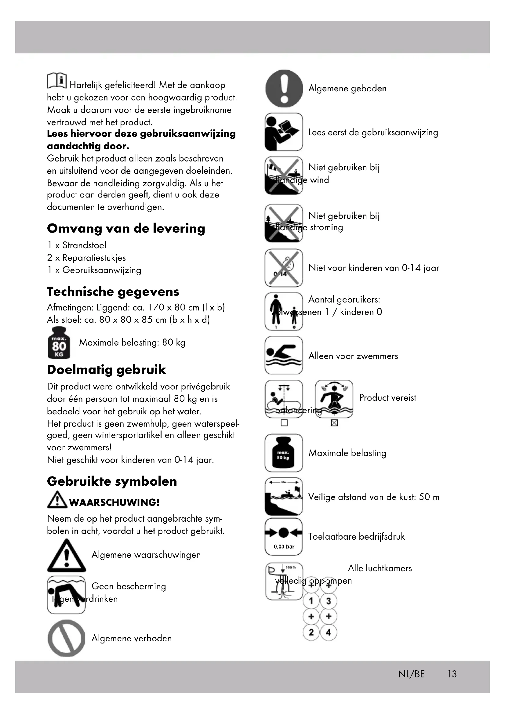 zone endommagée et appuyez fermement. Entretien, stockage Toujours entreposer l’article sec, propre et dégonflé dans une pièce tempérée. Lors du stockage, les valves doivent constamment rester fermées. Ne nettoyer qu’avec de l’eau ou de l’eau savonnée, jamais avec des produits d’entretiens agressifs. Pour l’entreposage en hiver, ne pas poser d’objets tranchants dessus et ne pas y appliquer du talc. Mise au rebut L’emballage et l’article doivent être éliminés de manière favorable à l’environnement. Eliminez l’article par l’intermédiaire d’une entre- prise de recyclage autorisée ou via les services compétents de votre commune. Veuillez tenir compte des directives actuelles en vigueur. IAN : 272429 Service Belgique Tel. : 070 270 171 (0,15 EUR/Min.) E-Mail : deltasport@lidl.be Veuillez trouver les pièces de rechange pour votre produit sur : www.delta-sport.com, rubrique Service - Service des pièces de rechange Lidl FR/BE13 Hartelijk gefeliciteerd! Met de aankoop hebt u gekozen voor een hoogwaardig product. Maak u daarom voor de eerste ingebruikname vertrouwd met het product. Lees hiervoor deze gebruiksaanwijzing aandachtig door. Gebruik het product alleen zoals beschreven en uitsluitend voor de aangegeven doeleinden. Bewaar de handleiding zorgvuldig. Als u het product aan derden geeft, dient u ook deze documenten te overhandigen. Omvang van de levering 1 x Strandstoel 2 x Reparatiestukjes 1 x Gebruiksaanwijzing Technische gegevens Afmetingen: Liggend: ca. 170 x 80 cm (l x b) Als stoel: ca. 80 x 80 x 85 cm (b x h x d) Maximale belasting: 80 kg Doelmatig gebruik Dit product werd ontwikkeld voor privégebruik door één persoon tot maximaal 80 kg en is bedoeld voor het gebruik op het water. Het product is geen zwemhulp, geen waterspeel- goed, geen wintersportartikel en alleen geschikt voor zwemmers! Niet geschikt voor kinderen van 0-14 jaar. Gebruikte symbolen WAARSCHUWING! Neem de op het product aangebrachte sym- bolen in acht, voordat u het product gebruikt. Algemene waarschuwingen Geen bescherming tegen verdrinken Algemene verboden Algemene geboden Lees eerst de gebruiksaanwijzing Niet gebruiken bij aflandige wind Niet gebruiken bij aflandige stroming Niet voor kinderen van 0-14 jaar Aantal gebruikers: Volwassenen 1 / kinderen 0 Alleen voor zwemmers Product vereist balancering Maximale belasting Veilige afstand van de kust: 50 m