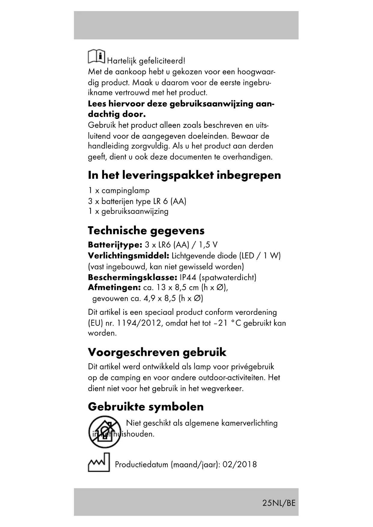 - Hanglamp (afb. F) Om de hanglamp te gebruiken klapt u het hengsel met de karabijnfunctie (1d) uit het artikel naar boven (afb. F). Opslag, reiniging Het artikel altijd droog en netjes in een op temperatuur gebrachte kamer opbergen. Uitsluitend met water reini- gen en vervolgens met een reinigingsdoek droogvegen. BELANGRIJK! Nooit met chemische reinigingsmiddelen reinigen. NL/BE29 Afvalverwerking Voer het artikel en verpakkingsmaterialen in over- eenstemming met actuele lokale voorschriften af. Verpak- kingsmaterialen, zoals bv. foliezakjes, horen niet thuis in kinderhanden. Berg het verpakkingsmateriaal buiten het bereik van kinderen op. Apparaten die met het hiernaast afgebeelde symbool gemarkeerd zijn, mogen niet samen met het huisvuil afgevoerd worden. U bent verplicht, dergelijke oude elektrische en elektronische apparaten afzonderlijk af te voeren. Gelieve bij uw gemeentebestu- ur naar de mogelijkheden van een reguliere afvalverwij- dering te informeren. Verwijder de batterij uit het artikel vóór de afvoer. Verwijderingsmaatregelen batte- rijen In acht nemen a.u.b.: Omdat het bij batterijen om bijzonder afval gaat dat volgens de wet niet samen met het huisvuil afgevoerd mag worden. U kunt onbruikbare batterijen op de gemeentelijke inzamelpunten of in de handel afgeven. Hier staan speciale verzamelbakken ter beschikking. Opmerkingen over garantie en serviceafhandeling Het product is geproduceerd met grote zorg en onder voortdurende controle. U ontvangt een garantie van drie jaar op dit product, vanaf de datum van aankoop. Bewaar alstublieft uw aankoopbewijs. De garantie geldt alleen voor materiaal- en fabricagefouten en vervalt bij foutief of oneigenlijk gebruik. Uw wettelijke rechten, met name het garantierecht, worden niet beïnvloed door deze garantie. In geval van reclamaties dient u zich aan de beneden genoemde service-hotline te wenden of zich per e-mail met ons in verbinding te zetten. Onze servicemedewerkers zullen de verdere handelswijze zo snel mogelijk met u afspreken. Wij zullen u in ieder geval persoonlijk te woord staan. NL/BE30 De garantieperiode wordt na eventuele reparaties en op basis van de garantie, wettelijke garantie of coulance niet verlengd. Dit geldt ook voor vervangen en gerepareerde delen. Na afloop van de garantieperiode dienen eventu- ele reparaties te worden betaald. IAN: 297011 Service België Tel.: 070 270 171 (0,15 EUR/Min.) E-Mail: deltasport@lidl.be Service Nederland Tel.: 0900 0400223 (0,10 EUR/Min.) E-Mail: deltasport@lidl.nl NL/BE31 Herzlichen Glückwunsch! Mit Ihrem Kauf haben Sie sich für einen hochwertigen Artikel entschieden. Machen Sie sich vor der ersten Verwendung mit dem Artikel vertraut. Lesen Sie hierzu aufmerksam die nachfol- gende Bedienungsanleitung. Benutzen Sie den Artikel nur wie beschrieben und für die angegebenen Einsatzbereiche. Bewahren Sie diese Anleitung gut auf. Händigen Sie alle Unterlagen bei Weitergabe des Artikels an Dritte ebenfalls mit aus. Lieferumfang 1 x Campinglampe 3 x Batterie Typ LR 6 (AA) 1 x Gebrauchsanleitung Technische Daten Batterietyp: 3 x LR6 (AA) / 1,5 V Leuchtmittel: Leuchtdiode (LED / 1 W) (fest einge- baut, kann nicht gewechselt werden) Schutzart: IP44 (spritzwassergeschützt) Maße: ca. 13 x 8,5 cm (H x Ø), gefaltet ca. 4,9 x 8,5 cm (H x Ø) Dieser Artikel ist ein Spezialprodukt nach Verordnung (EU) Nr. 1194/2012, da er bis –21 °C verwendet werden kann. Bestimmungsgemäße Verwendung Dieser Artikel ist für Camping und andere Outdoo- raktivitäten als Leuchte für den privaten Gebrauch entwickelt worden. Er dient nicht zur Verwendung im Straßenverkehr. Verwendete Symbole Nicht zur allgemeinen Raumbeleuchtung im Haushalt geeignet. DE/AT/CH32 Herstellungsdatum (Monat/Jahr): 02/2018 Sicherheitshinweise Wichtig: Lesen Sie diese Gebrauchsanleitung sorgfältig und bewahren Sie sie unbedingt auf!