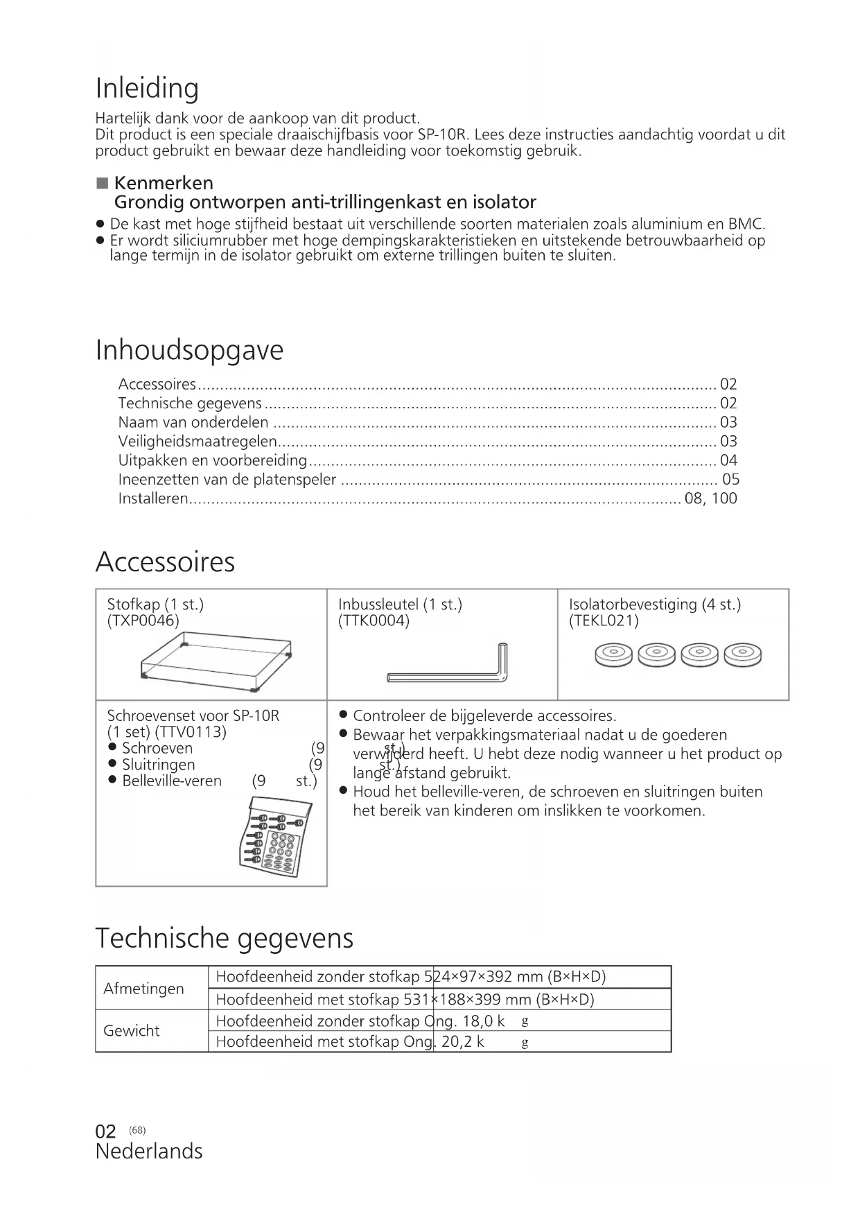 Er wordt siliciumrubber met hoge dempingskarakteristieken en uitstekende betrouwbaarheid op lange termijn in de isolator gebruikt om externe trillingen buiten te sluiten. Inleiding Hartelijk dank voor de aankoop van dit product. Dit product is een speciale draaischijfbasis voor SP-10R. Lees deze instructies aandachtig voordat u dit product gebruikt en bewaar deze handleiding voor toekomstig gebruik. Accessoires Stofkap (1 st.) (TXP0046) Inbussleutel (1 st.) (TTK0004) Isolatorbevestiging (4 st.) (TEKL021) Schroevenset voor SP-10R (1 set)