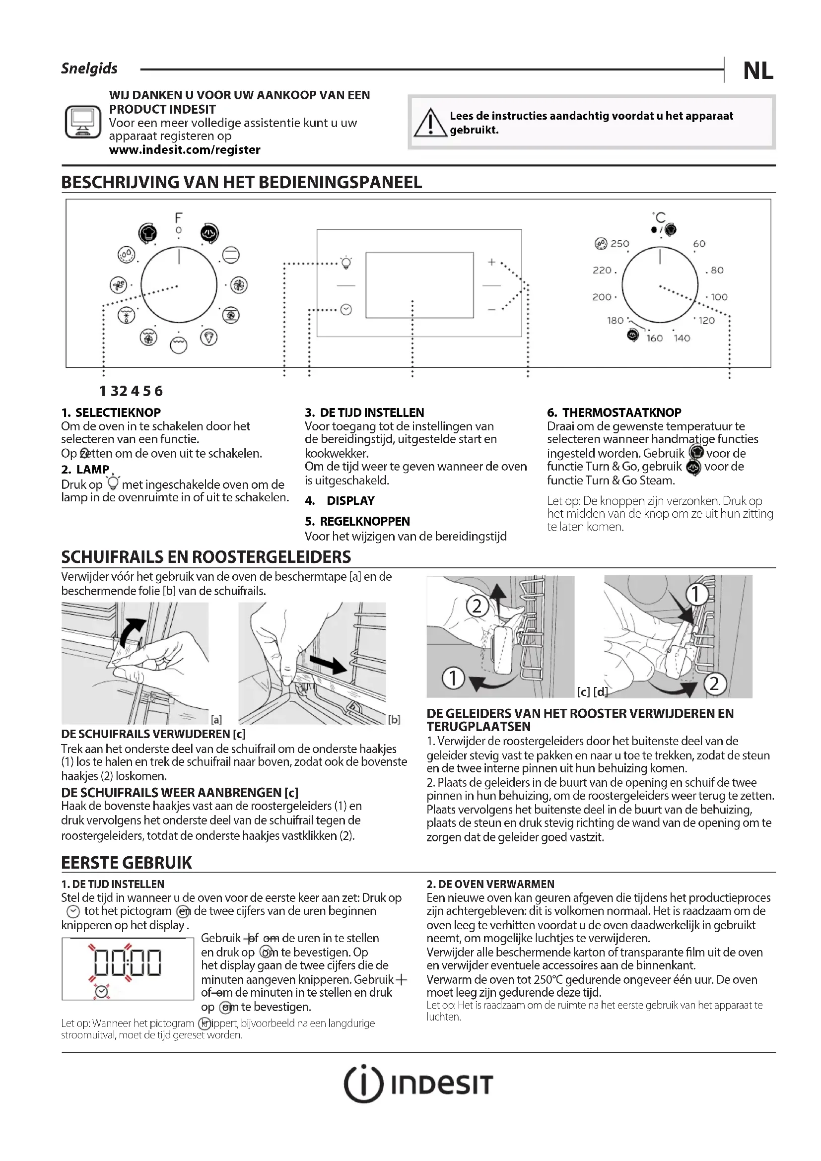 5. REGELKNOPPENVoor het wijzigen van de bereidingstijd6. THERMOSTAATKNOPDraai om de gewenste temperatuur te selecteren wanneer handmatige functies ingesteld worden. Gebruik voor de functie Turn & Go, gebruik voor de functie Turn & Go Steam.Let op: De knoppen zijn verzonken. Druk op het midden van de knop om ze uit hun zitting te laten komen.WIJ DANKEN U VOOR UW AANKOOP VAN EEN PRODUCT INDESITVoor een meer volledige assistentie kunt u uw apparaat registeren op www.indesit.com/registerLees de instructies aandachtig voordat u het apparaat gebruikt.FUNCTIES & DAGELIJKS GEBRUIK