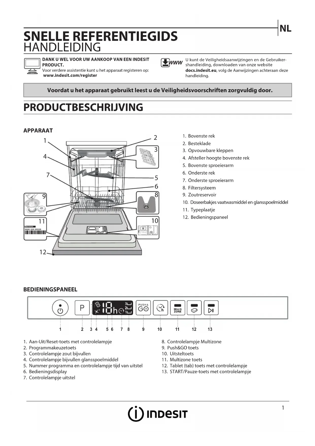 SNELLE REFERENTIEGIDS HANDLEIDING Voordat u het apparaat gebruikt leest u de Veiligheidsvoorschriften zorgvuldig door. PRODUCTBESCHRIJVING APPARAATBEDIENINGSPANEELDANK U WEL VOOR UW AANKOOP VAN EEN INDESIT PRODUCT. Voor verdere assistentie kunt u het apparaat registeren op: www.indesit.com/registerU kunt de Veiligheidsaanwijzingen en de Gebruiker-shandleiding, downloaden van onze website docs.indesit.eu, volg de Aanwijzingen achteraan deze handleiding.1. Bovenste rek2. Besteklade3. Opvouwbare kleppen4. Afsteller hoogte bovenste rek5. Bovenste sproeierarm6. Onderste rek7. Onderste sproeierarm8. Filtersysteem9. Zoutreservoir10. Doseerbakjes vaatwasmiddel en glansspoelmiddel11. Typeplaatje12. Bedieningspaneel1. Aan-Uit/Reset-toets met controlelampje2. Programmakeuzetoets3. Controlelampje zout bijvullen4. Controlelampje bijvullen glansspoelmiddel5. Nummer programma en controlelampje tijd van uitstel6. Bedieningsdisplay7. Controlelampje uitstel8. Controlelampje Multizone9. Push&GO toets10. Uitsteltoets11. Multizone toets12. Tablet (tab) toets met controlelampje13. START/Pauze-toets met controlelampje