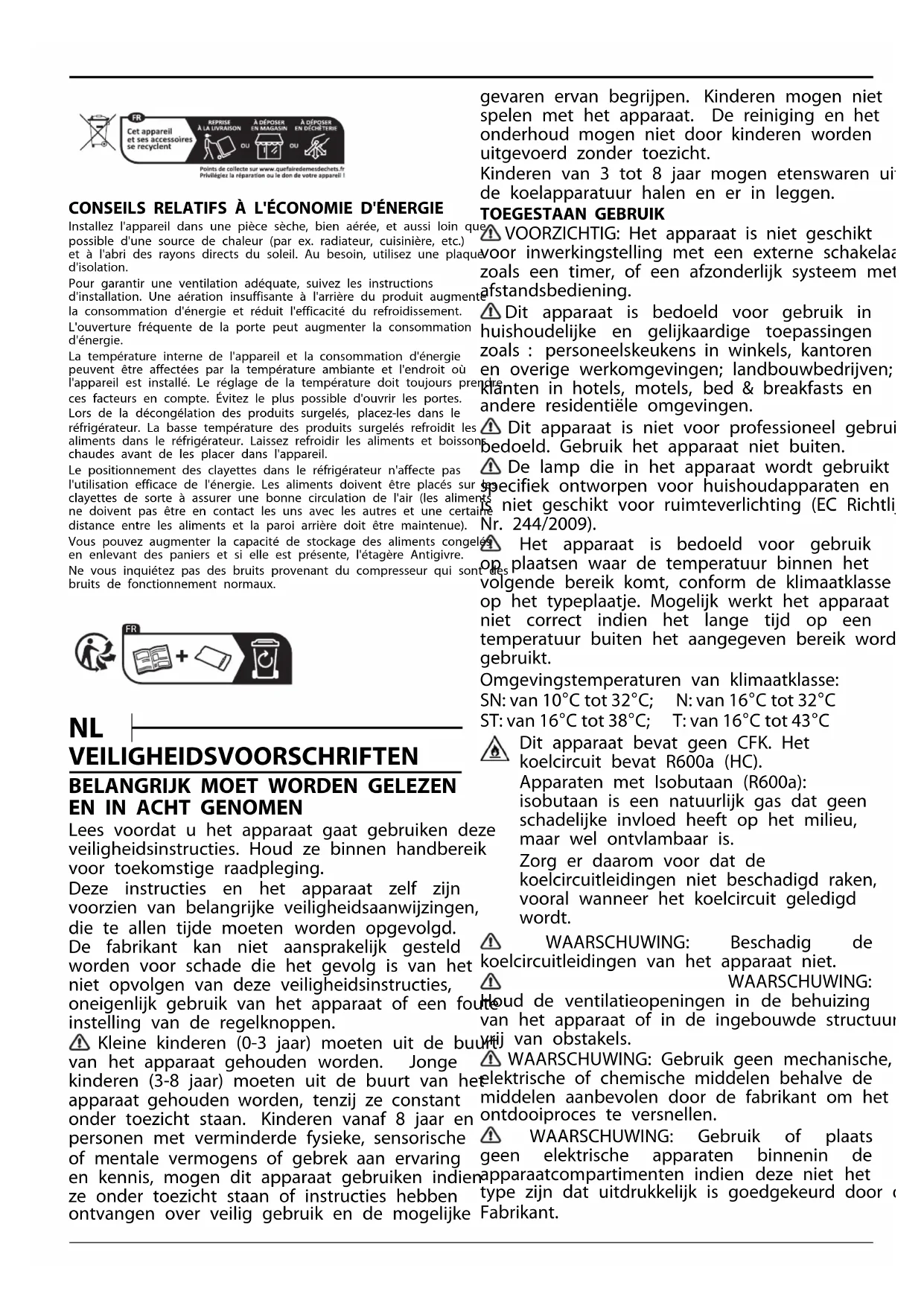 Lees voordat u het apparaat gaat gebruiken deze veiligheidsinstructies. Houd ze binnen handbereik voor toekomstige raadpleging. Deze instructies en het apparaat zelf zijn voorzien van belangrijke veiligheidsaanwijzingen, die te allen tijde moeten worden opgevolgd. De fabrikant kan niet aansprakelijk gesteld worden voor schade die het gevolg is van het niet opvolgen van deze veiligheidsinstructies, oneigenlijk gebruik van het apparaat of een foute instelling van de regelknoppen. Kleine kinderen (0-3 jaar) moeten uit de buurt van het apparaat gehouden worden. Jonge kinderen (3-8 jaar) moeten uit de buurt van het apparaat gehouden worden, tenzij ze constant onder toezicht staan. Kinderen vanaf 8 jaar en personen met verminderde fysieke, sensorische of mentale vermogens of gebrek aan ervaring en kennis, mogen dit apparaat gebruiken indien ze onder toezicht staan of instructies hebben ontvangen over veilig gebruik en de mogelijke gevaren ervan begrijpen. Kinderen mogen niet spelen met het apparaat. De reiniging en het onderhoud mogen niet door kinderen worden uitgevoerd zonder toezicht. Kinderen van 3 tot 8 jaar mogen etenswaren uit de koelapparatuur halen en er in leggen. TOEGESTAAN GEBRUIK VOORZICHTIG: Het apparaat is niet geschikt voor inwerkingstelling met een externe schakelaar zoals een timer, of een afzonderlijk systeem met afstandsbediening. Dit apparaat is bedoeld voor gebruik in huishoudelijke en gelijkaardige toepassingen zoals : personeelskeukens in winkels, kantoren en overige werkomgevingen; landbouwbedrijven; klanten in hotels, motels, bed & breakfasts en andere residentiële omgevingen. Dit apparaat is niet voor professioneel gebruik bedoeld. Gebruik het apparaat niet buiten. De lamp die in het apparaat wordt gebruikt is specifiek ontworpen voor huishoudapparaten en is niet geschikt voor ruimteverlichting (EC Richtlijn Nr. 244/2009). Het apparaat is bedoeld voor gebruik op plaatsen waar de temperatuur binnen het volgende bereik komt, conform de klimaatklasse op het typeplaatje. Mogelijk werkt het apparaat niet correct indien het lange tijd op een temperatuur buiten het aangegeven bereik wordt gebruikt. Omgevingstemperaturen van klimaatklasse: SN: van 10°C tot 32°C; N: van 16°C tot 32°C ST: van 16°C tot 38°C; T: van 16°C tot 43°C Dit apparaat bevat geen CFK. Het koelcircuit bevat R600a (HC). Apparaten met Isobutaan (R600a): isobutaan is een natuurlijk gas dat geen schadelijke invloed heeft op het milieu, maar wel ontvlambaar is. Zorg er daarom voor dat de koelcircuitleidingen niet beschadigd raken, vooral wanneer het koelcircuit geledigd wordt. WAARSCHUWING: Beschadig de koelcircuitleidingen van het apparaat niet. WAARSCHUWING: Houd de ventilatieopeningen in de behuizing van het apparaat of in de ingebouwde structuur vrij van obstakels. WAARSCHUWING: Gebruik geen mechanische, elektrische of chemische middelen behalve de middelen aanbevolen door de fabrikant om het ontdooiproces te versnellen. WAARSCHUWING: Gebruik of plaats geen elektrische apparaten binnenin de apparaatcompartimenten indien deze niet het type zijn dat uitdrukkelijk is goedgekeurd door de Fabrikant.WAARSCHUWING: IJsmakers en/of waterdispensers die niet rechtstreeks op het waterleidingnet zijn aangesloten, mogen uitsluitend met drinkwater worden gevuld. WAARSCHUWING: Automatische ijsmakers en/of waterdispensers moeten worden aangesloten op een waterleidingnet dat uitsluitend drinkwater levert, met een waterdruk tussen 0,17 en 0,81 MPa (1,7 en 8,1 bar). Geen ontplofbare stoffen zoals spuitbussen opslaan en geen benzine of andere brandbare materialen gebruiken in of in de buurt van het apparaat. Slik de (niet-giftige) vloeistof uit de vrieselementen niet in (bij enkele modellen). Eet geen ijsblokjes of waterijsjes die net uit de vriezer komen, aangezien deze vriesbrandwonden kunnen veroorzaken. Bij producten ontworpen voor gebruik met een luchtfilter in een toegankelijke ventilatorafdekking, moet het filter altijd zijn aangebracht wanneer de koelkast in bedrijf is. Bewaar geen glazen containers met vloeistoffen in het diepvriezercompartiment omdat ze kunnen breken. Blokkeer de ventilator (indien aanwezig) niet met levensmiddelen. Controleernadatulevensmiddeleninhetapparaat heeft geplaatst of de deuren van de vakken goed zijn gesloten, met name de deur van het vriesvak. Een beschadigde afdichting dient zo snel mogelijk vervangen te worden. Gebruik het koelkastcompartiment uitsluitend voor het bewaren van vers voedsel en het diepvriezercompartiment uitsluitend voor het bewaren van bevroren voedsel, het invriezen van vers voedsel en het maken van ijsblokjes. Bewaar geen onverpakt voedsel in het koel- of vriesgedeelte om direct contact met interne oppervlakken te voorkomen. Apparaten kunnen over speciale compartimenten beschikken (vak voor verse etenswaar, nul graden-vak,...). Indien niet anders gespecificeerd in de productbeschrijving, kunnen deze compartimenten verwijderd worden zonder dat hierdoor de prestaties veranderen. C-pentaan wordt gebruikt als blaasmiddel in het isolatieschuim en is een licht ontvlambaar gas. Rekening houdend met de temperatuursverschillen in de verschillende koelkastcompartimenten, kunnen etenswaren het beste als volgt worden bewaard: - Koelkastcompartiment: