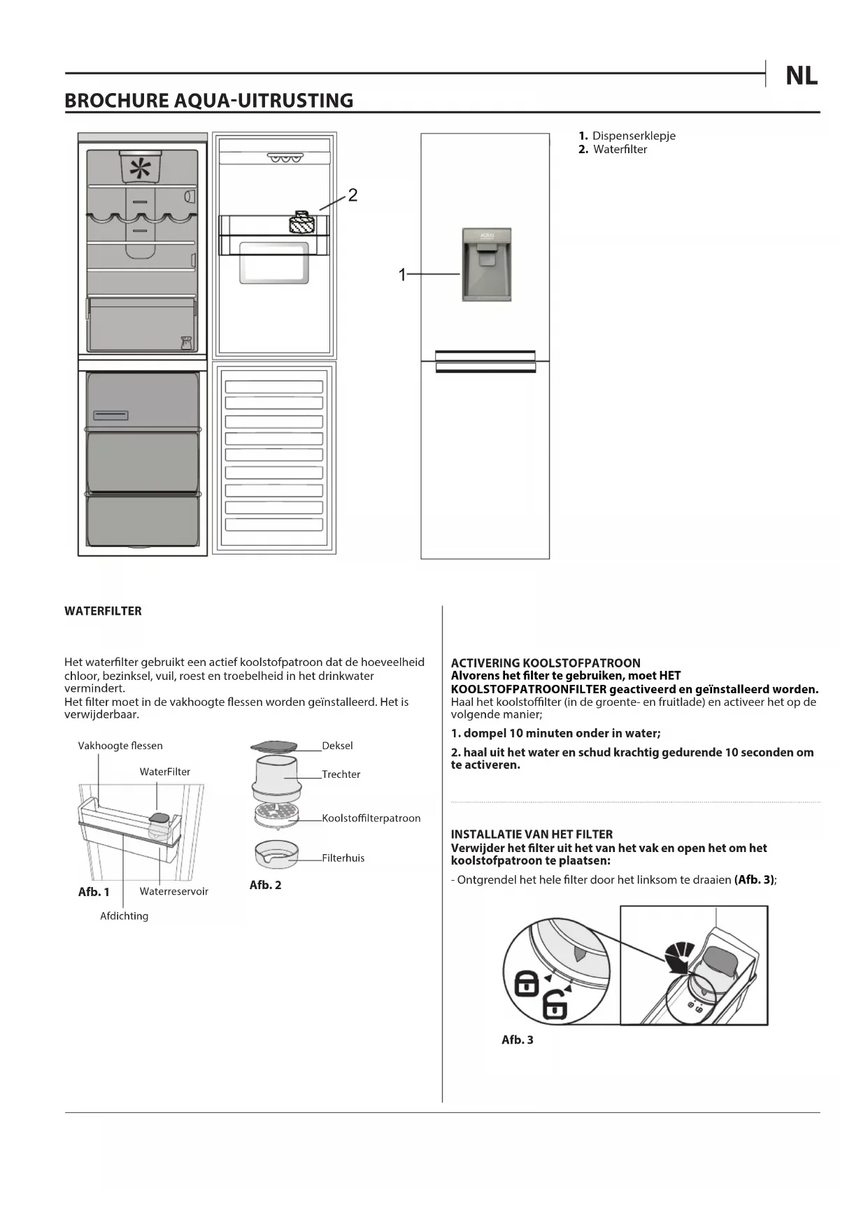 WATERFILTER Het waterlter gebruikt een actief koolstofpatroon dat de hoeveelheid chloor, bezinksel, vuil, roest en troebelheid in het drinkwater vermindert. Het lter moet in de vakhoogte essen worden geïnstalleerd. Het is verwijderbaar. Afb. 1 Afb. 2 Vakhoogte essen WaterFilter Waterreservoir Deksel Trechter Koolstolterpatroon Filterhuis Afdichting ACTIVERING KOOLSTOFPATROON Alvorens het lter te gebruiken, moet HET KOOLSTOFPATROONFILTER geactiveerd en geïnstalleerd worden. Haal het koolstolter (in de groente- en fruitlade) en activeer het op de volgende manier;