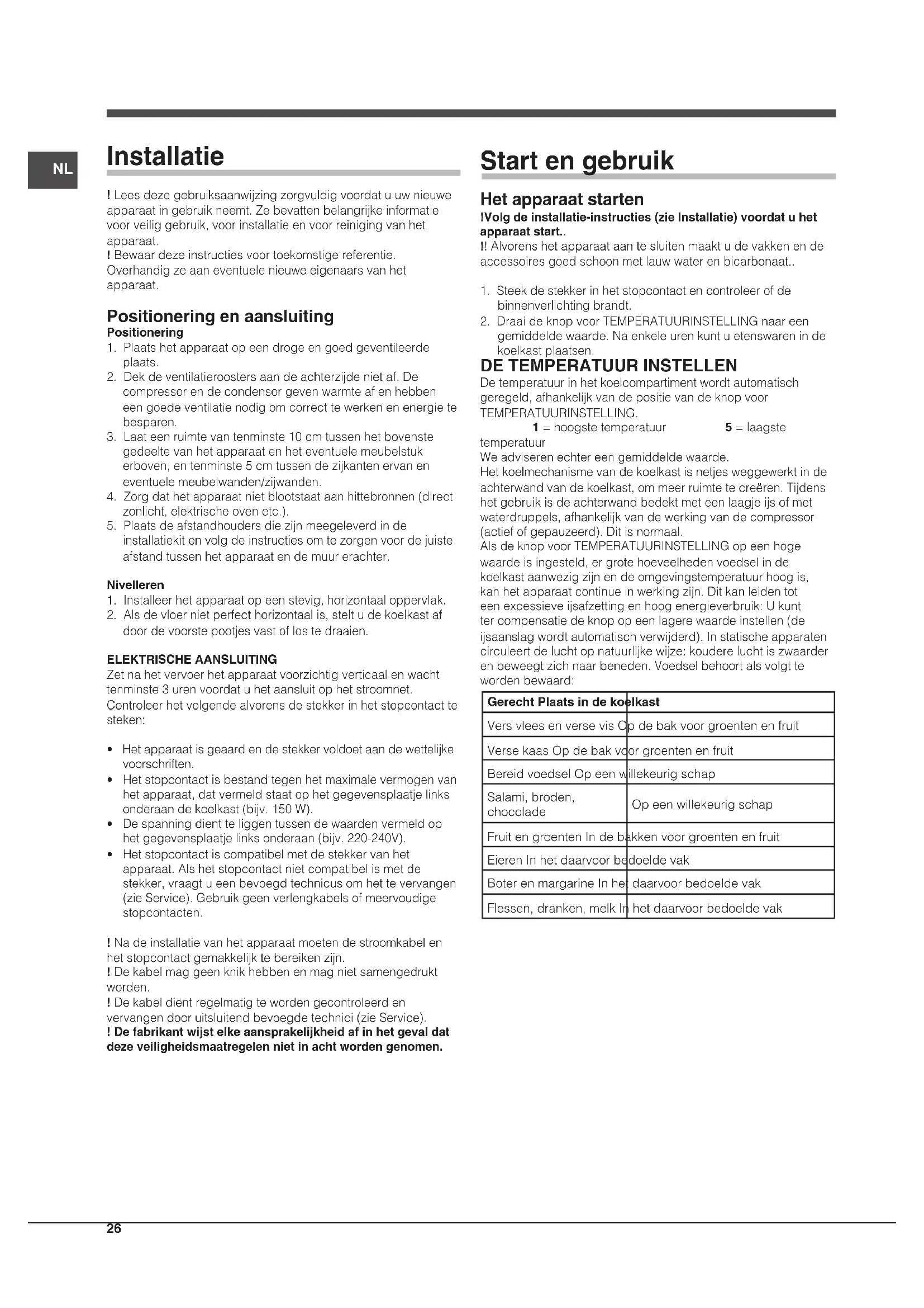 De temperatuur in het koelcompartiment wordt automatisch geregeld, afhankelijk van de positie van de knop voor TEMPERATUURINSTELLING. 1 = hoogste temperatuur 5 = laagste temperatuur We adviseren echter een gemiddelde waarde. Het koelmechanisme van de koelkast is netjes weggewerkt in de achterwand van de koelkast, om meer ruimte te creëren. Tijdens het gebruik is de achterwand bedekt met een laagje ijs of met waterdruppels, afhankelijk van de werking van de compressor (actief of gepauzeerd). Dit is normaal. Als de knop voor TEMPERATUURINSTELLING op een hoge waarde is ingesteld, er grote hoeveelheden voedsel in de koelkast aanwezig zijn en de omgevingstemperatuur hoog is, kan het apparaat continue in werking zijn. Dit kan leiden tot een excessieve ijsafzetting en hoog energieverbruik: U kunt ter compensatie de knop op een lagere waarde instellen (de ijsaanslag wordt automatisch verwijderd). In statische apparaten circuleert de lucht op natuurlijke wijze: koudere lucht is zwaarder en beweegt zich naar beneden. Voedsel behoort als volgt te worden bewaard: Gerecht Plaats in de koelkast Vers vlees en verse vis Op de bak voor groenten en fruit Verse kaas Op de bak voor groenten en fruit Bereid voedsel Op een willekeurig schap Salami, broden, chocolade Op een willekeurig schap Fruit en groenten In de bakken voor groenten en fruit Eieren In het daarvoor bedoelde vak Boter en margarine In het daarvoor bedoelde vak Flessen, dranken, melk In het daarvoor bedoelde vakNL
