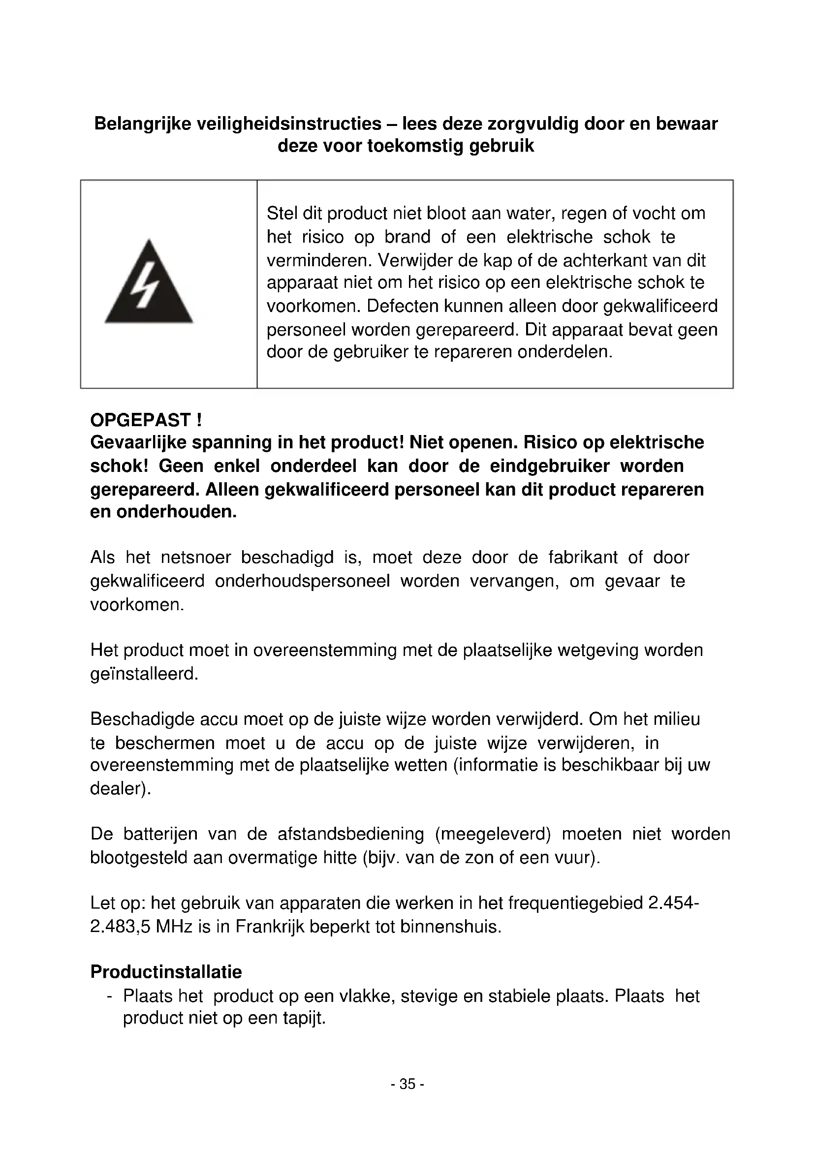 Stel dit product niet bloot aan water, regen of vocht om het risico op brand of een elektrische schok te verminderen. Verwijder de kap of de achterkant van dit apparaat niet om het risico op een elektrische schok te voorkomen. Defecten kunnen alleen door gekwalificeerd personeel worden gerepareerd. Dit apparaat bevat geen door de gebruiker te repareren onderdelen.