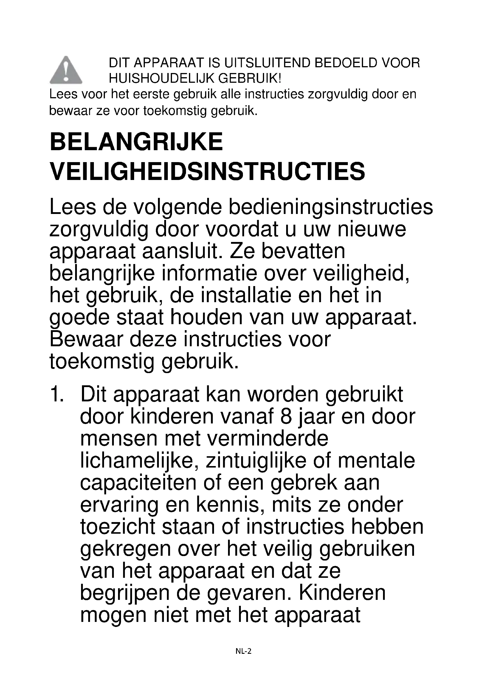 HUISHOUDELIJK GEBRUIK! Lees voor het eerste gebruik alle instructies zorgvuldig door en bewaar ze voor toekomstig gebruik. BELANGRIJKE VEILIGHEIDSINSTRUCTIES Lees de volgende bedieningsinstructies zorgvuldig door voordat u uw nieuwe apparaat aansluit. Ze bevatten belangrijke informatie over veiligheid, het gebruik, de installatie en het in goede staat houden van uw apparaat. Bewaar deze instructies voor toekomstig gebruik.