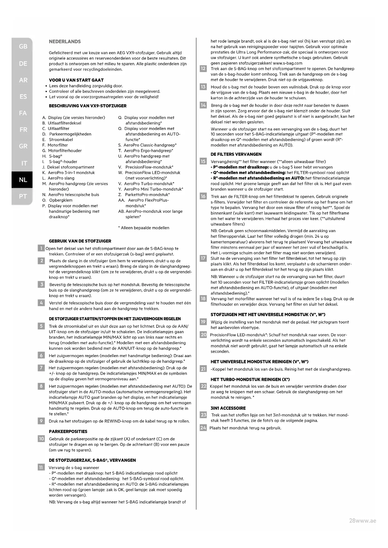 PT28www.aeg.com NEDERLANDS Gefeliciteerd met uw keuze van een AEG VX9-stofzuiger. Gebruik altijd originele accessoires en reserveonderdelen voor de beste resultaten. Dit product is ontworpen om het milieu te sparen. Alle plastic onderdelen zijn gemarkeerd voor recyclingdoeleinden.
