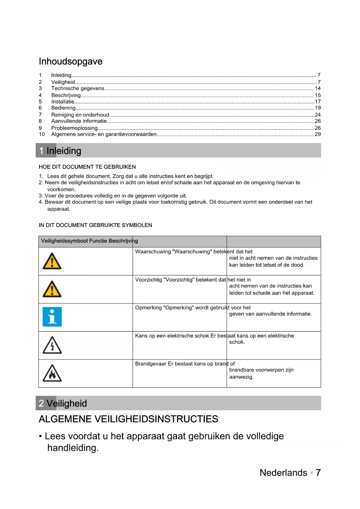 Veiligheidssymbool Functie Beschrijving Waarschuwing "Waarschuwing" betekent dat het niet in acht nemen van de instructies kan leiden tot letsel of de dood. Voorzichtig "Voorzichtig" betekent dat het niet in acht nemen van de instructies kan leiden tot schade aan het apparaat. Opmerking "Opmerking" wordt gebruikt voor het geven van aanvullende informatie. Kans op een elektrische schok Er bestaat kans op een elektrische schok. Brandgevaar Er bestaat kans op brand of brandbare voorwerpen zijn aanwezig. 2 Veiligheid ALGEMENE VEILIGHEIDSINSTRUCTIES