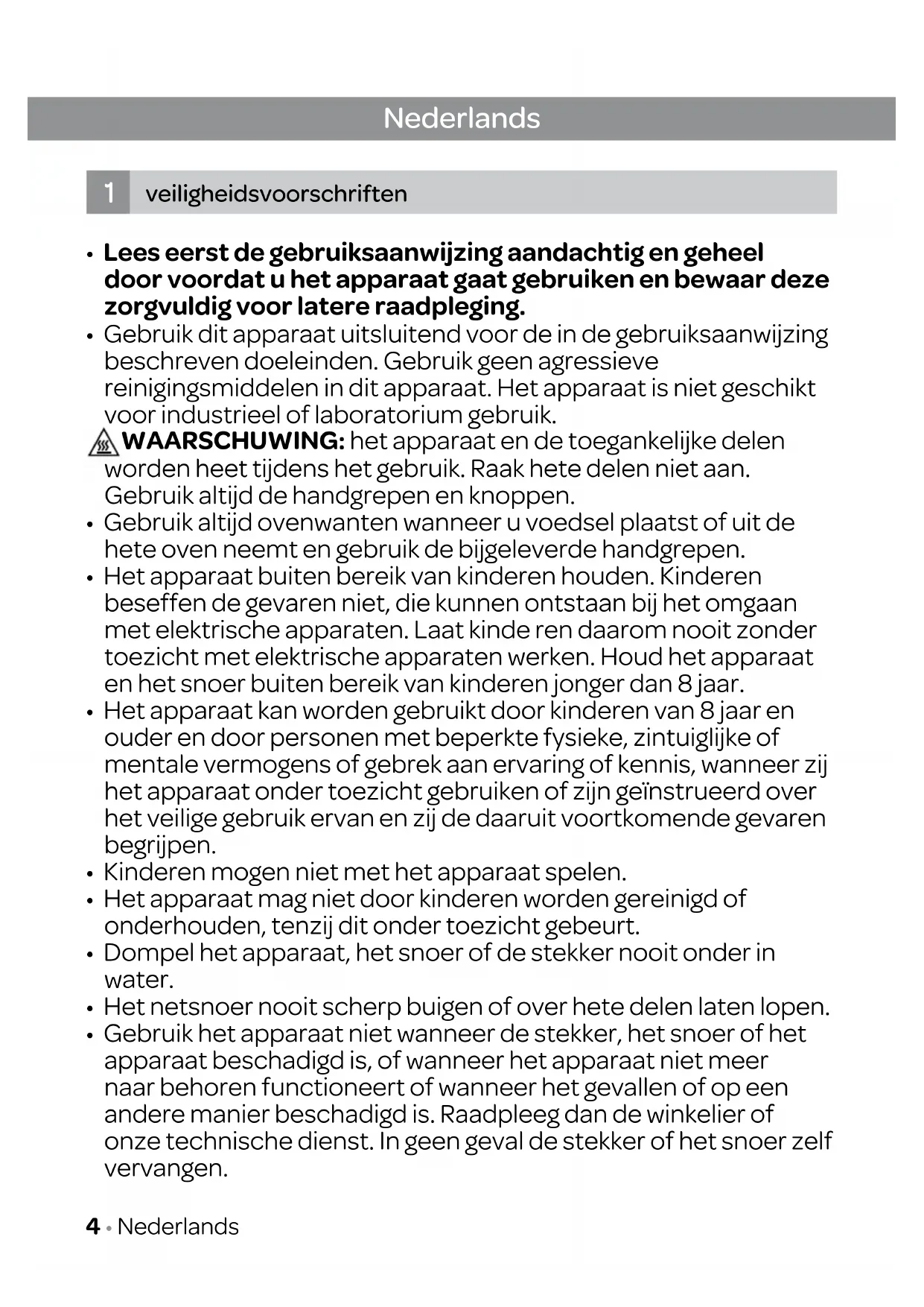 - Gebruik dit apparaat uitsluitend voor de in de gebruiksaanwijzing beschreven doeleinden. Gebruik geen agressieve reinigingsmiddelen in dit apparaat. Het apparaat is niet geschikt voor industrieel of laboratorium gebruik. WAARSCHUWING: het apparaat en de toegankelijke delen worden heet tijdens het gebruik. Raak hete delen niet aan. Gebruik altijd de handgrepen en knoppen.