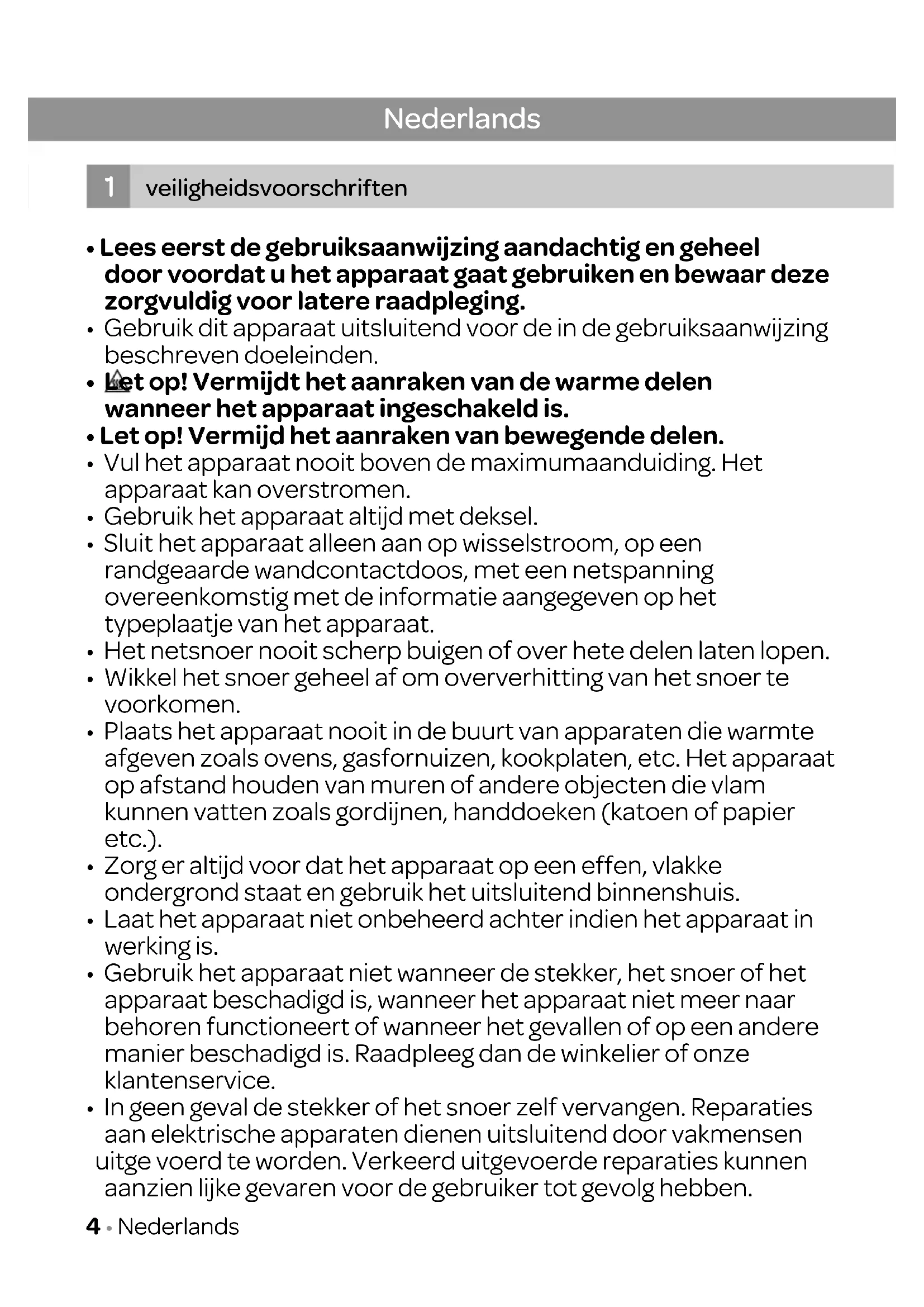 - In geen geval de stekker of het snoer zelf vervangen. Reparaties aan elektrische apparaten dienen uitsluitend door vakmensen uitge voerd te worden. Verkeerd uitgevoerde reparaties kunnen aanzien lijke gevaren voor de gebruiker tot gevolg hebben. Nederlands veiligheidsvoorschriften