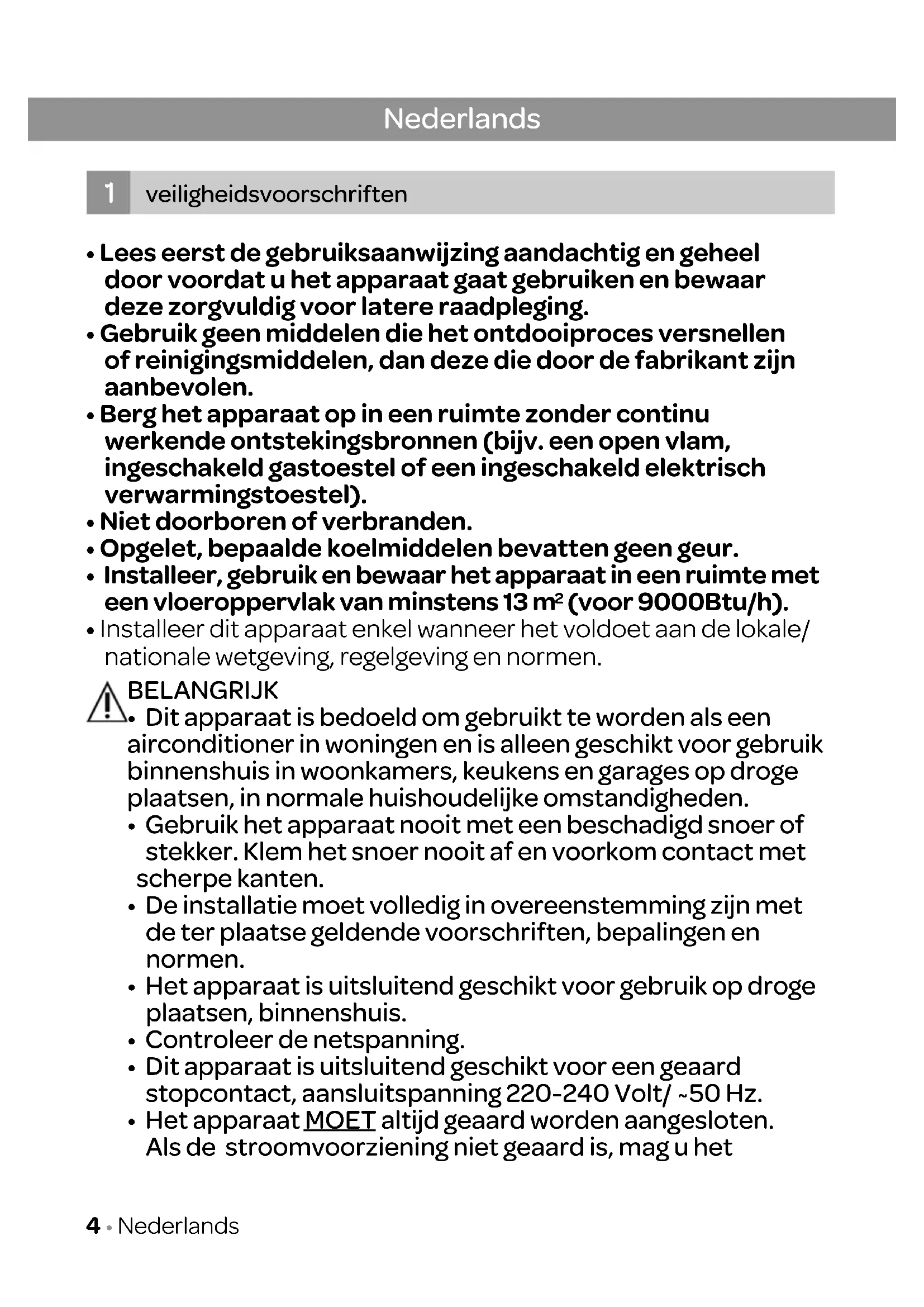 - Het apparaat MOET altijd geaard worden aangesloten. Als de stroomvoorziening niet geaard is, mag u het Nederlands veiligheidsvoorschriften